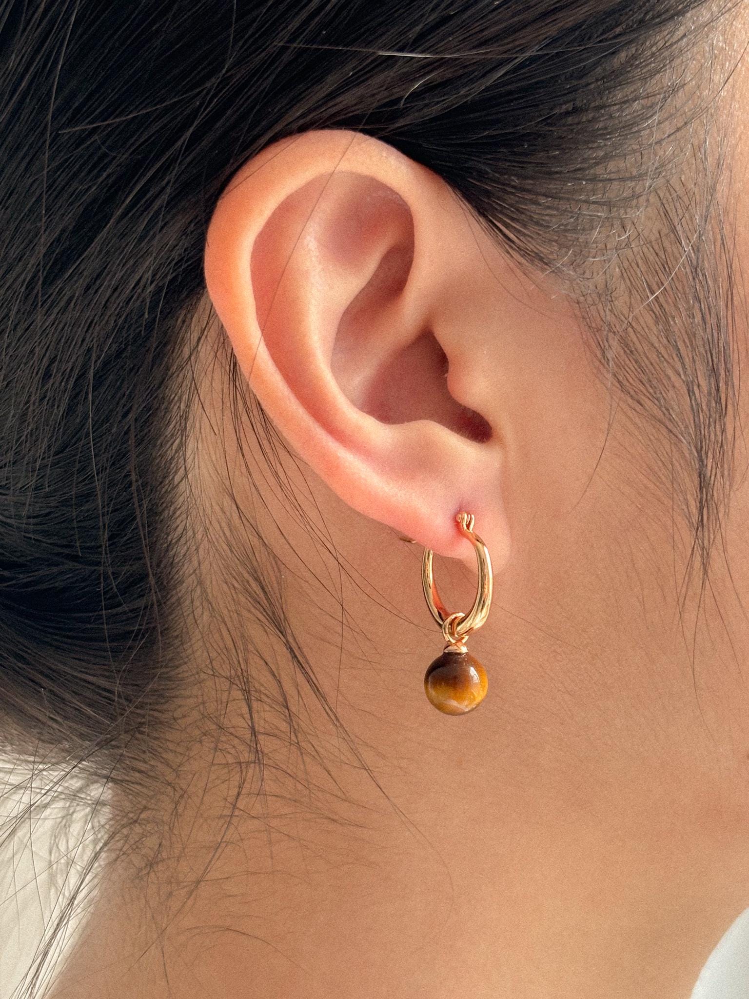 Tiger Eye Earrings Gold Hoop Earrings Tiger Eye Gemstone Drop Natur...