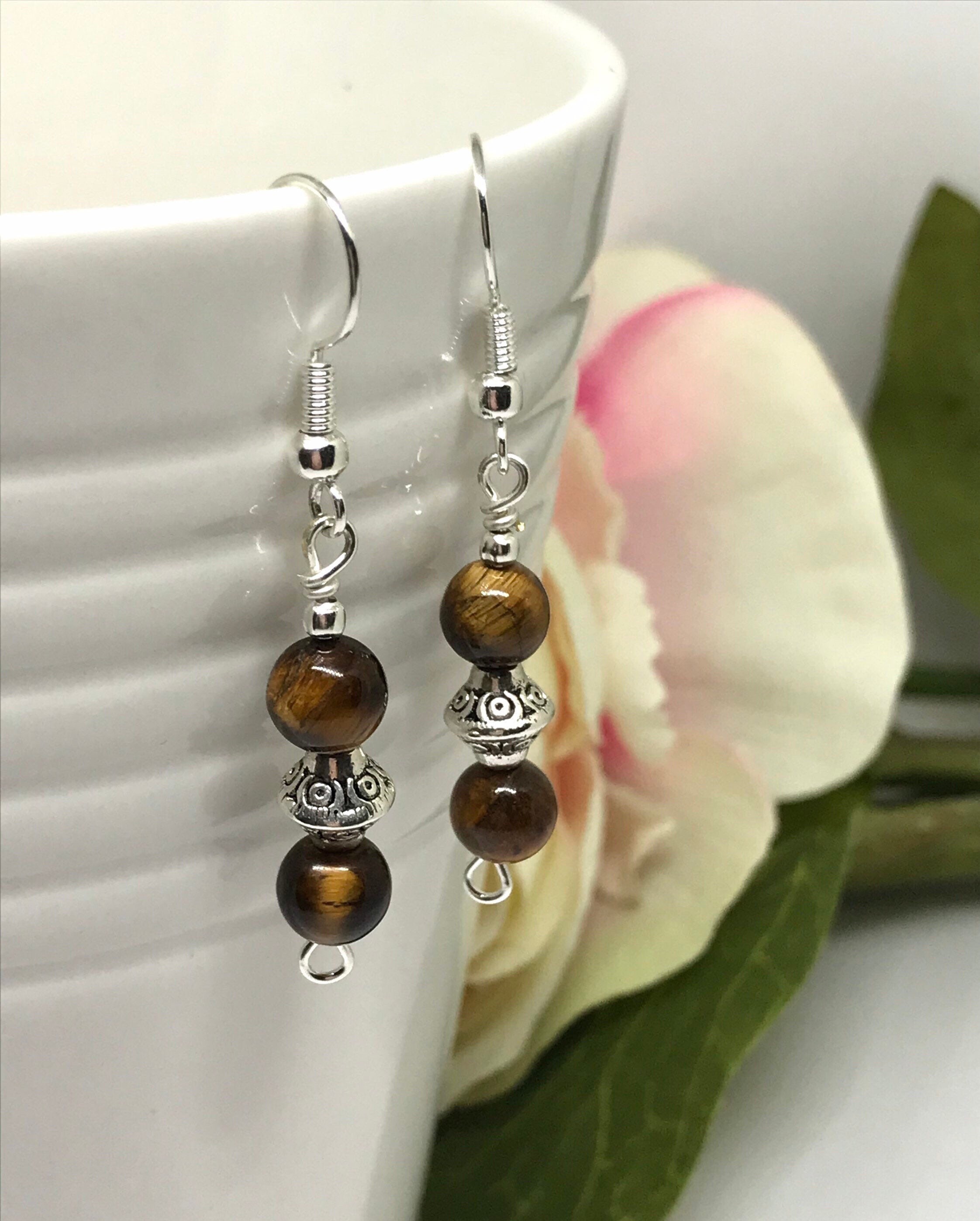 Dainty Tiger Eye Earrings, Tiger Eye Gemstone Drop Earrings, Healing Gemstone Jewelry, Silver Tiger ...