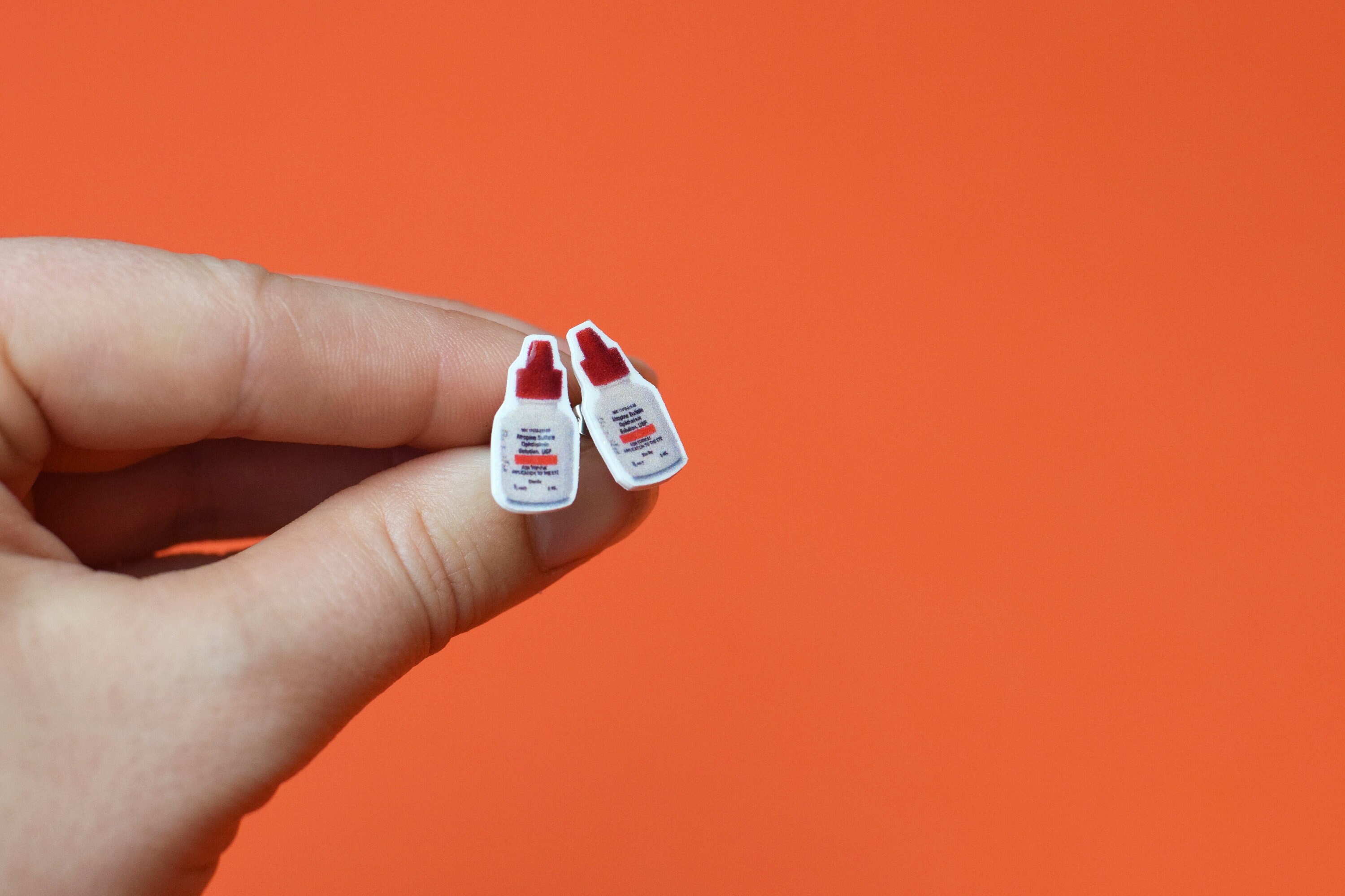 This tiny set of stud earrings feature Atropine eye drop bottle. These will for sure be a conversati...