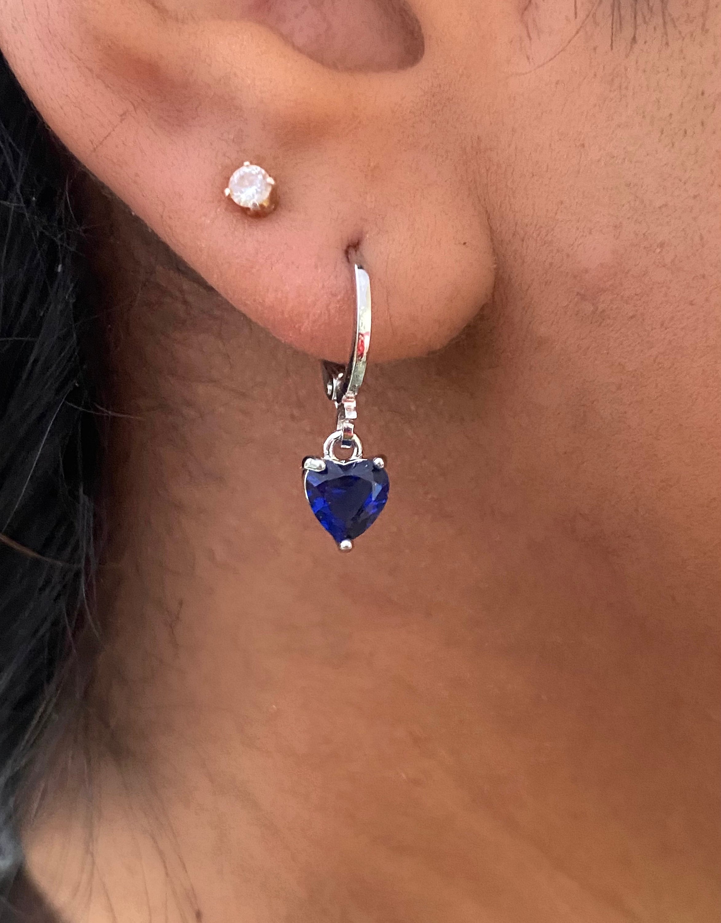Beautiful, silver-plated mini huggie earrings with a small blue heart gemstone pendant. The small ho...