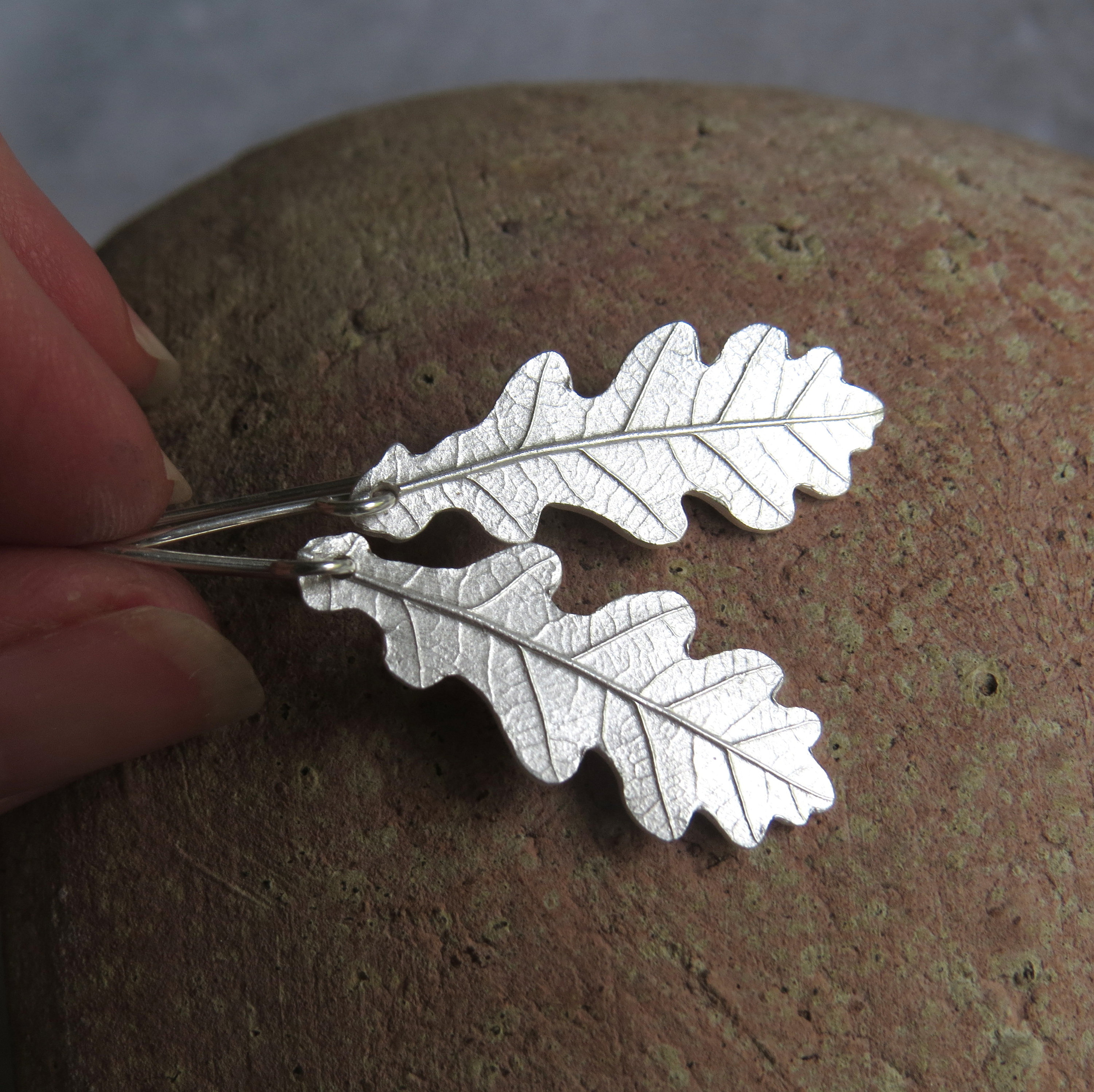 "These wonderful eye-catching realistic oak leaf earrings are made of shiny fine silver and ste...