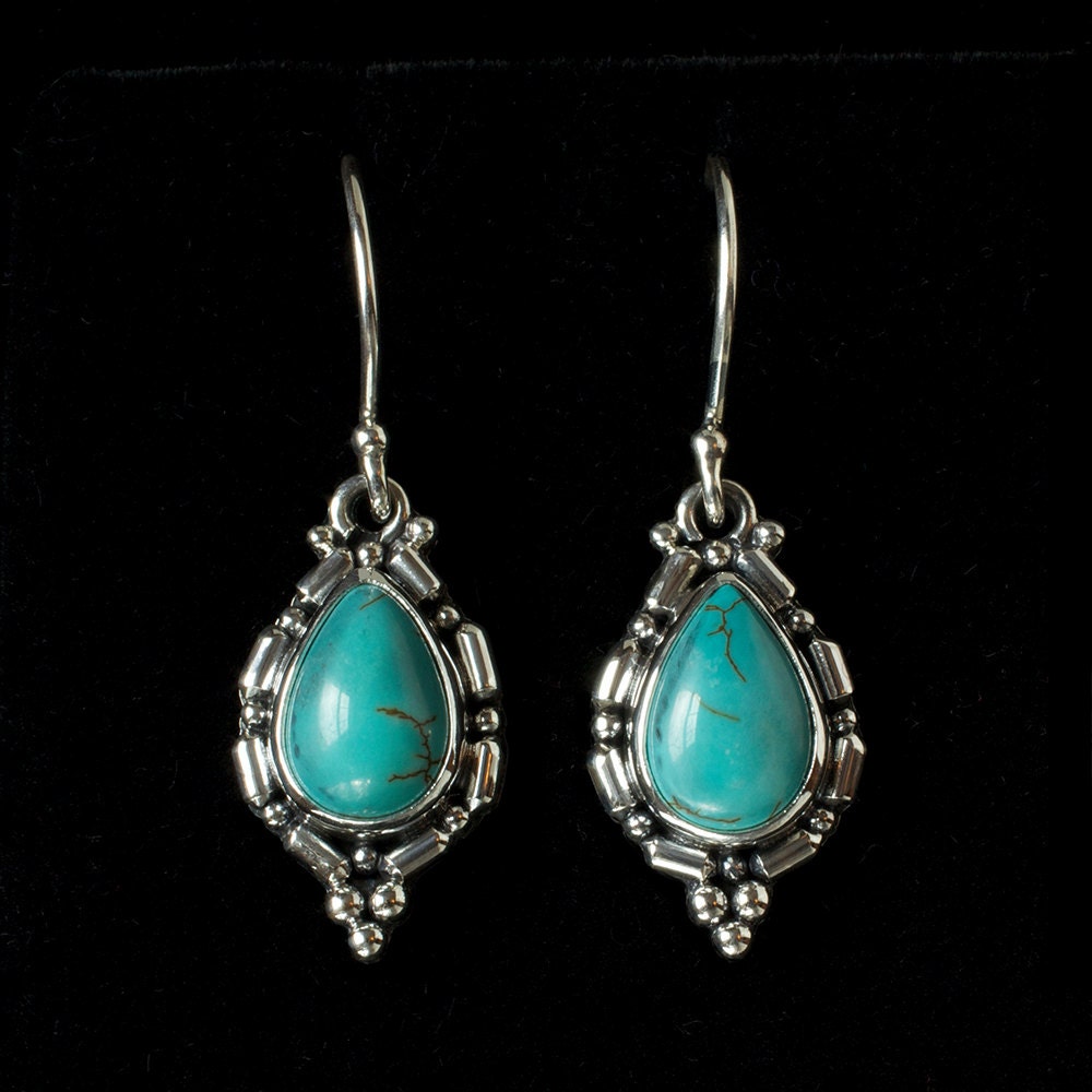 "Sterling Silver Turquoise earrings featuring teardrop Tibetan Turquoise gemstones set in intri...