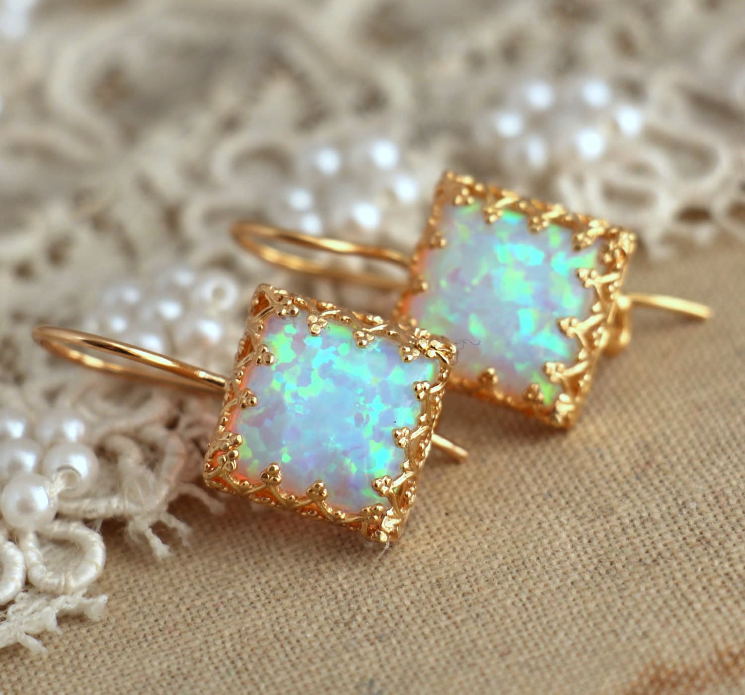 Opal earrings, Opal drop earrings, Opal Gold earrings, White opal e...