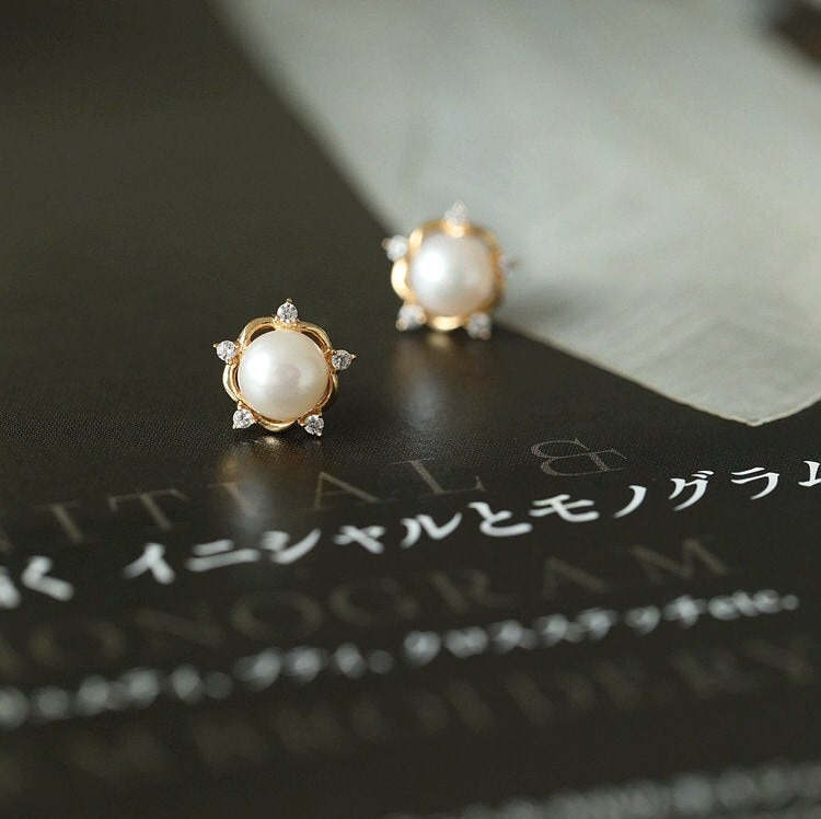Dainty Pearl Earrings, Pearl Earrings Studs, Pearl Flower Earrings,...