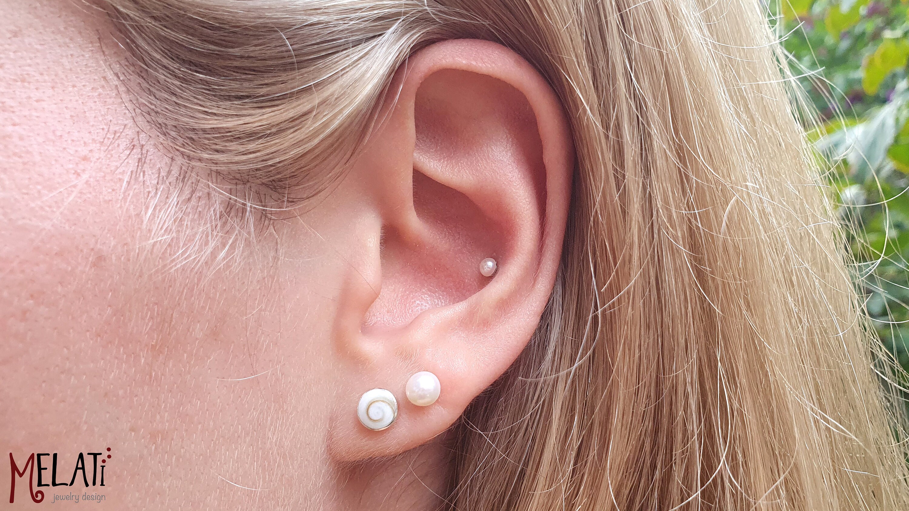Sweet and dainty pearl stud earrings. They're small, perfect for multiple piercings! - - - D E T A I...