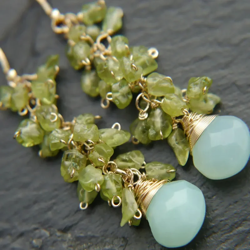 Aqua Chalcedony Peridot Cluster Teardrop Long Dangle Earrings