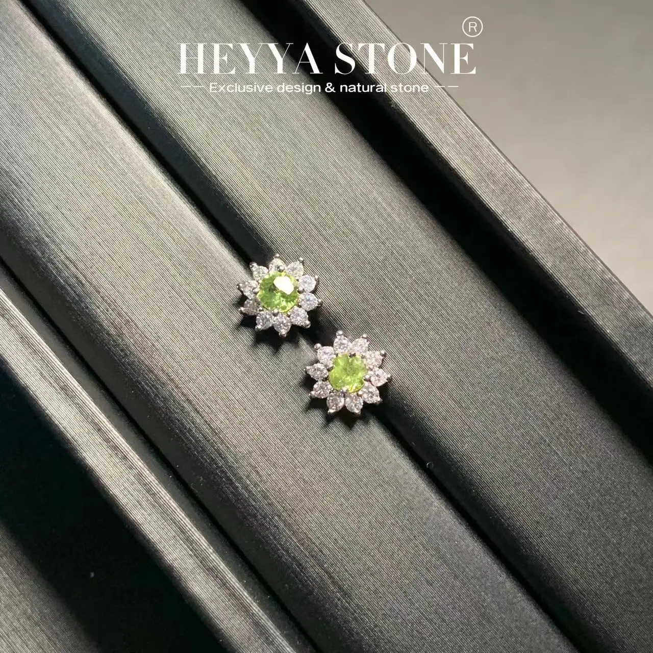 HEYYA STONE Round Natural Peridot Stud Earrings For Women 925 Silve...
