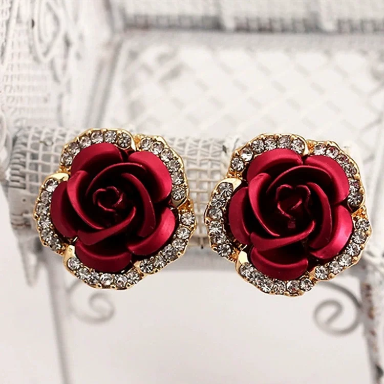 Rose Shaped 4 Color Alloy Rhinestone Stud Earring Rose Ear Clip Wom...