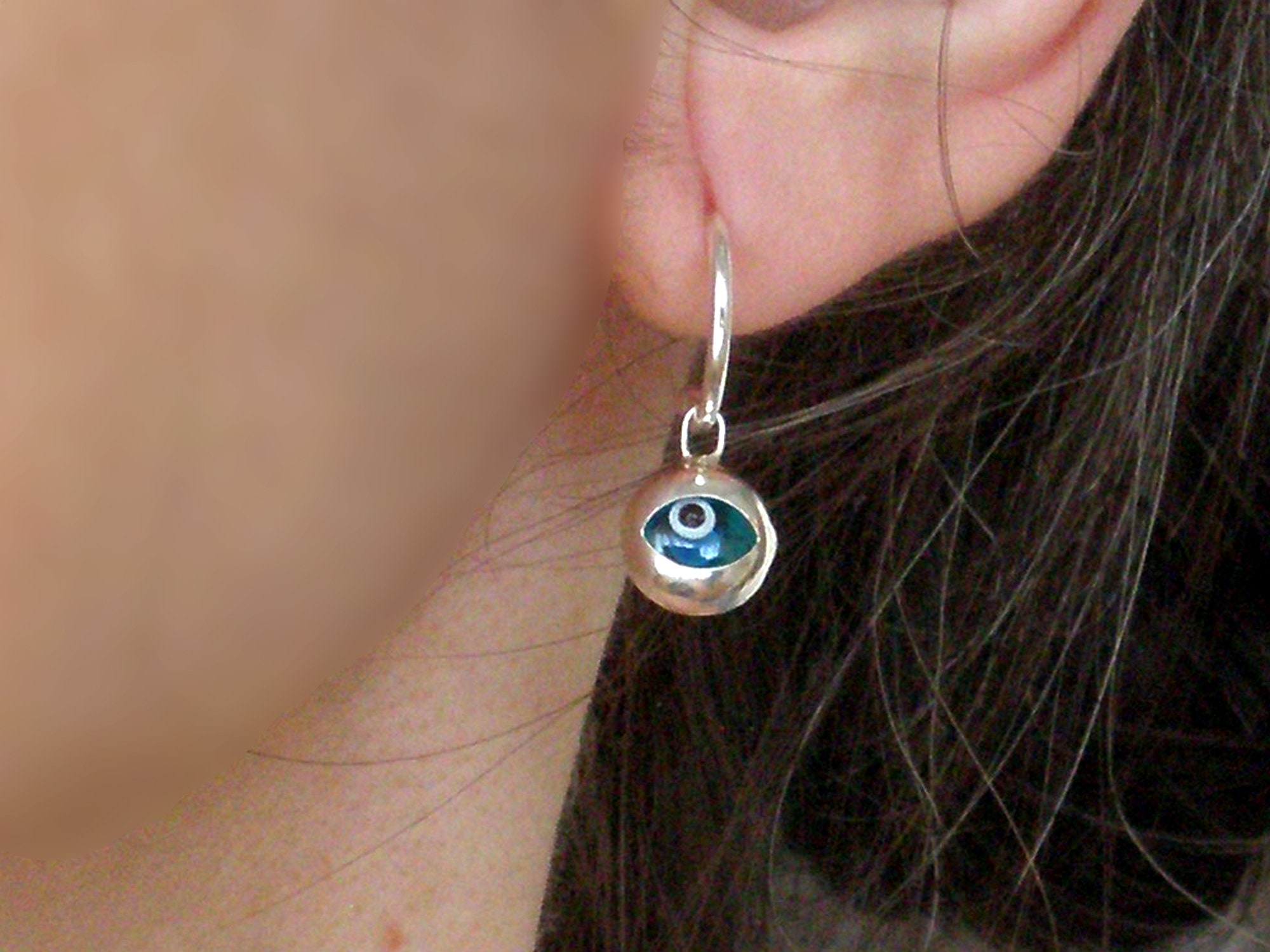 "Sterling silver evil eye earrings. 925 sterling silver Length: 1.02\" (2,6 cm) Width: 0.4...