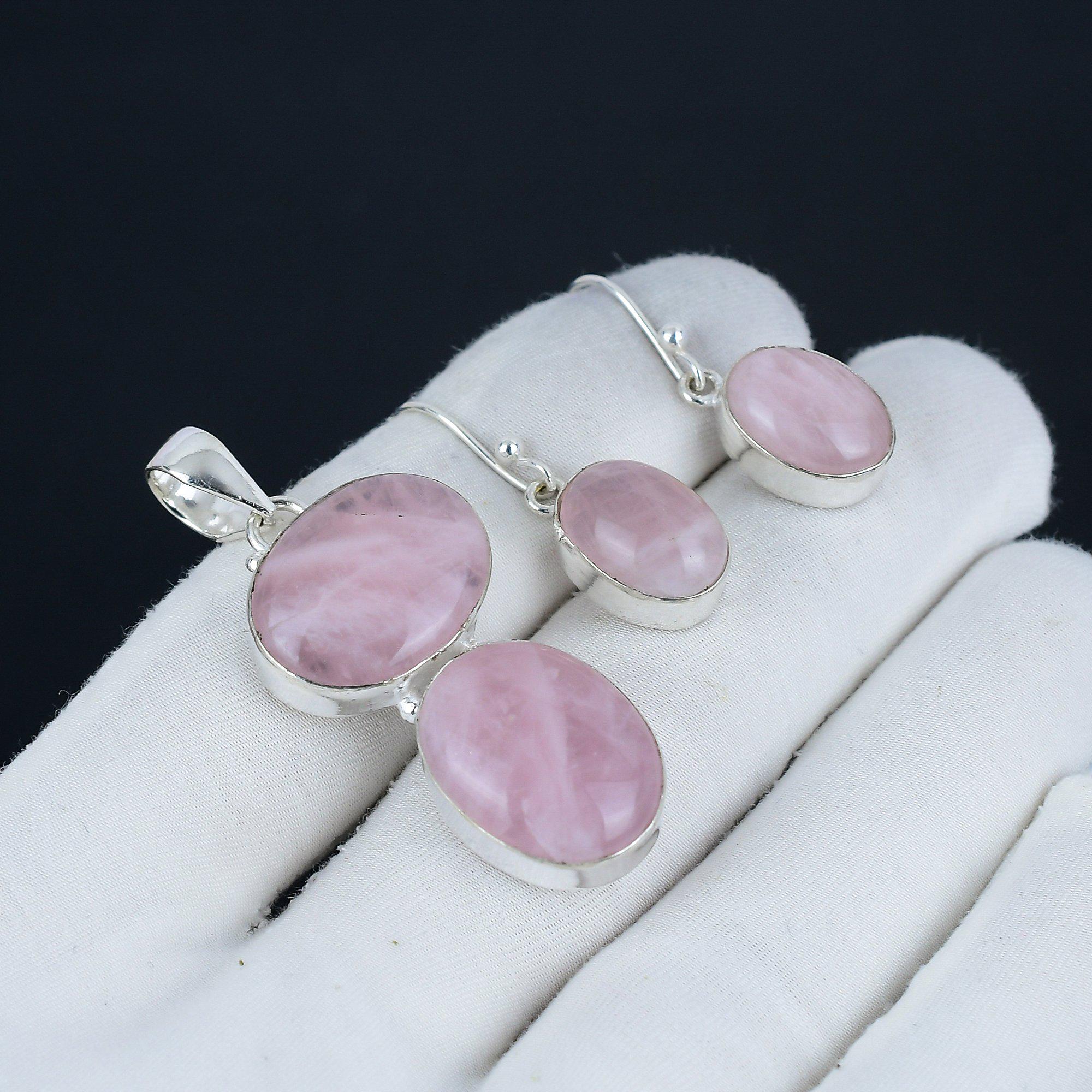 Rose Quartz Gemstone Handmade 925 Sterling Silver Pendant Earrings Set Natural Rose Quartz Gemstone ...