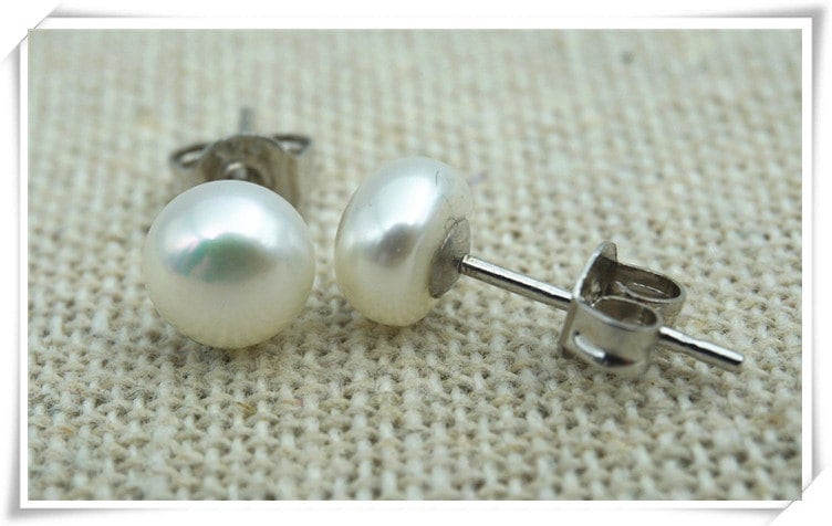 A pair of cultured freshwater pearl stud earrings 7-8MM in sterling silver post. Pearl size: 7-8MM. ...