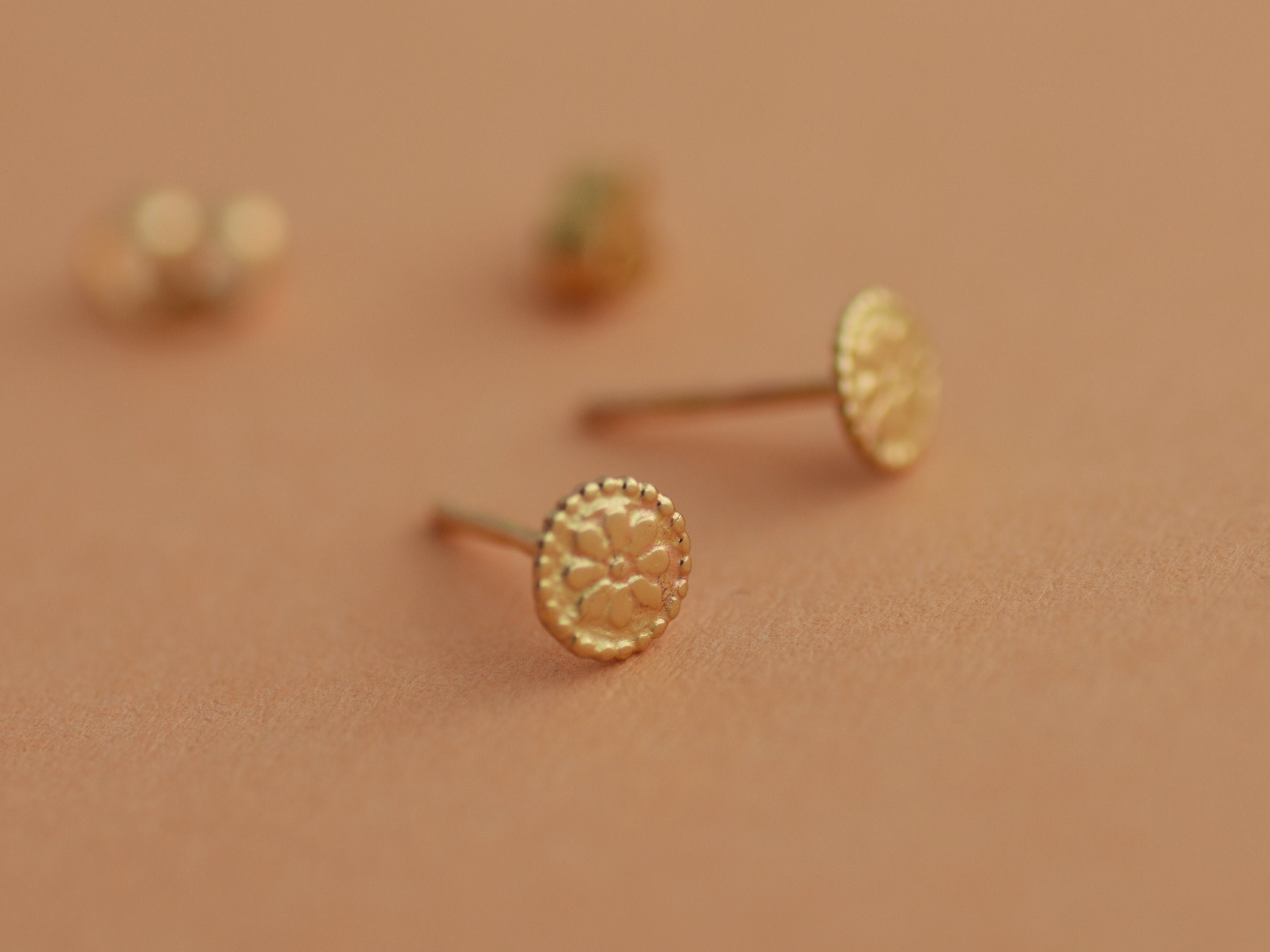 Round Gold Studs, 14k Gold Stud Earrings, Flower Studs, Tiny Gold s...