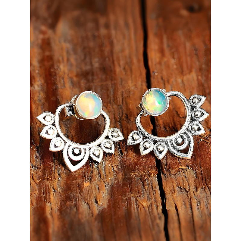 Women's Bohemian Opal Stud Earrings with Vintage Lotus Design &ndas...