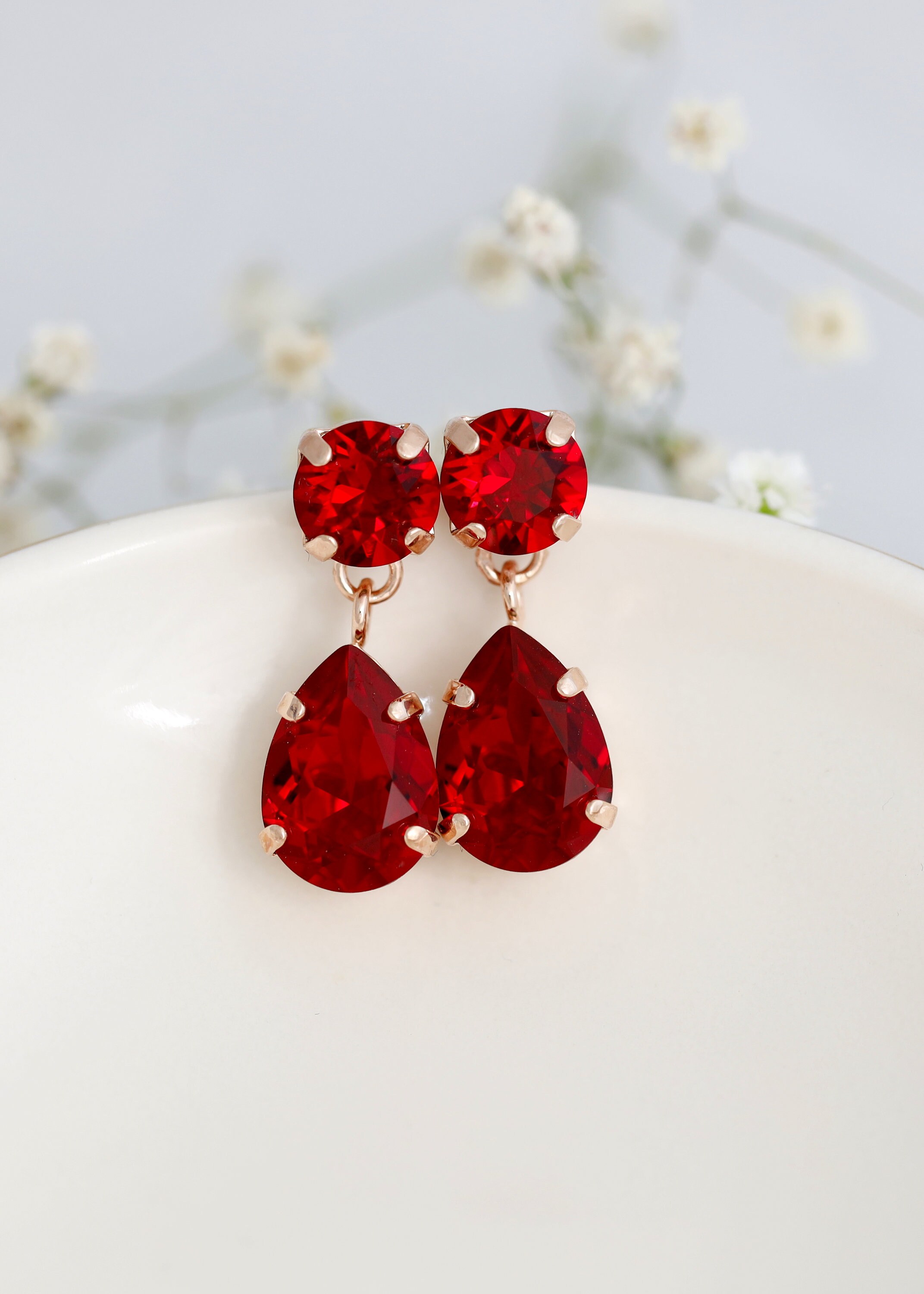 "Our Red Garnet Droplets, Bridal Red Small Crystal Chandelier Earrings, and Red Ruby Drop Chand...