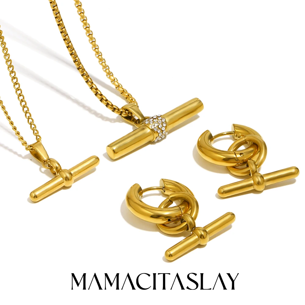 MamacitaSlay 316L Stainless Steel T-Bar Pendant Necklace Earrings Waterproof 18K Gold Plated Jewelry...