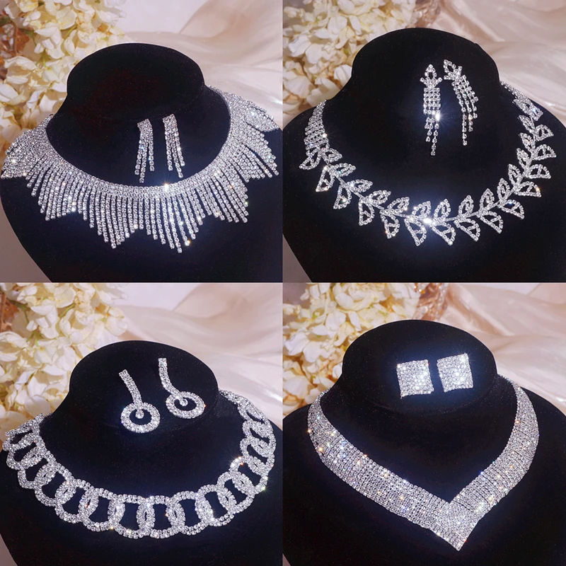 Sparkling Rhinestone Necklace Earrings Set for Women Silver Color Elegant Crystal Choker Necklace Br...