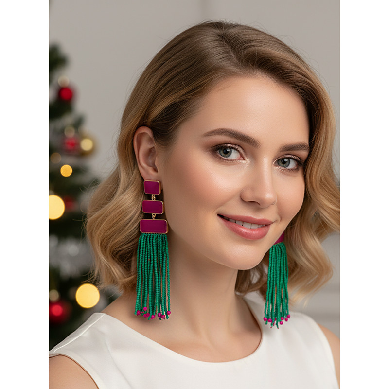 Women's Red and Green Beaded Tassel Earrings - Festive Christmas Je...