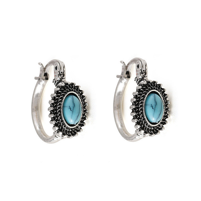 Boho Silver Hoop Earrings with Turquoise Gemstone – Vintage T...