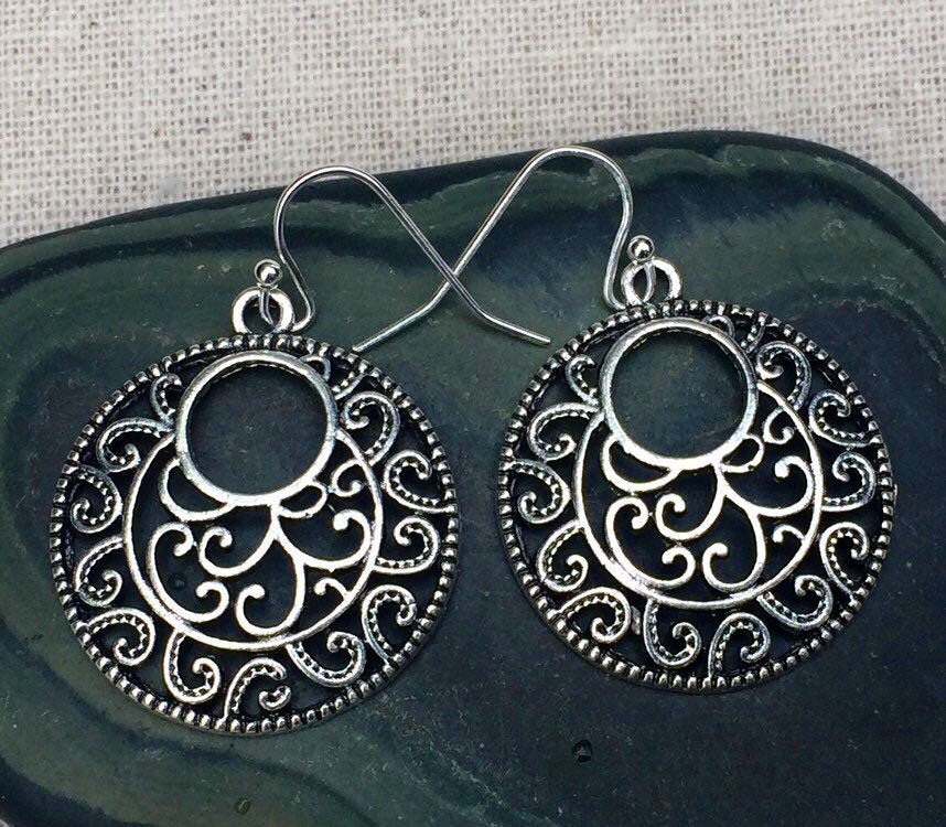 "Silver boho filigree circle earrings. They are perfect for everyday wear! These are versatile ...