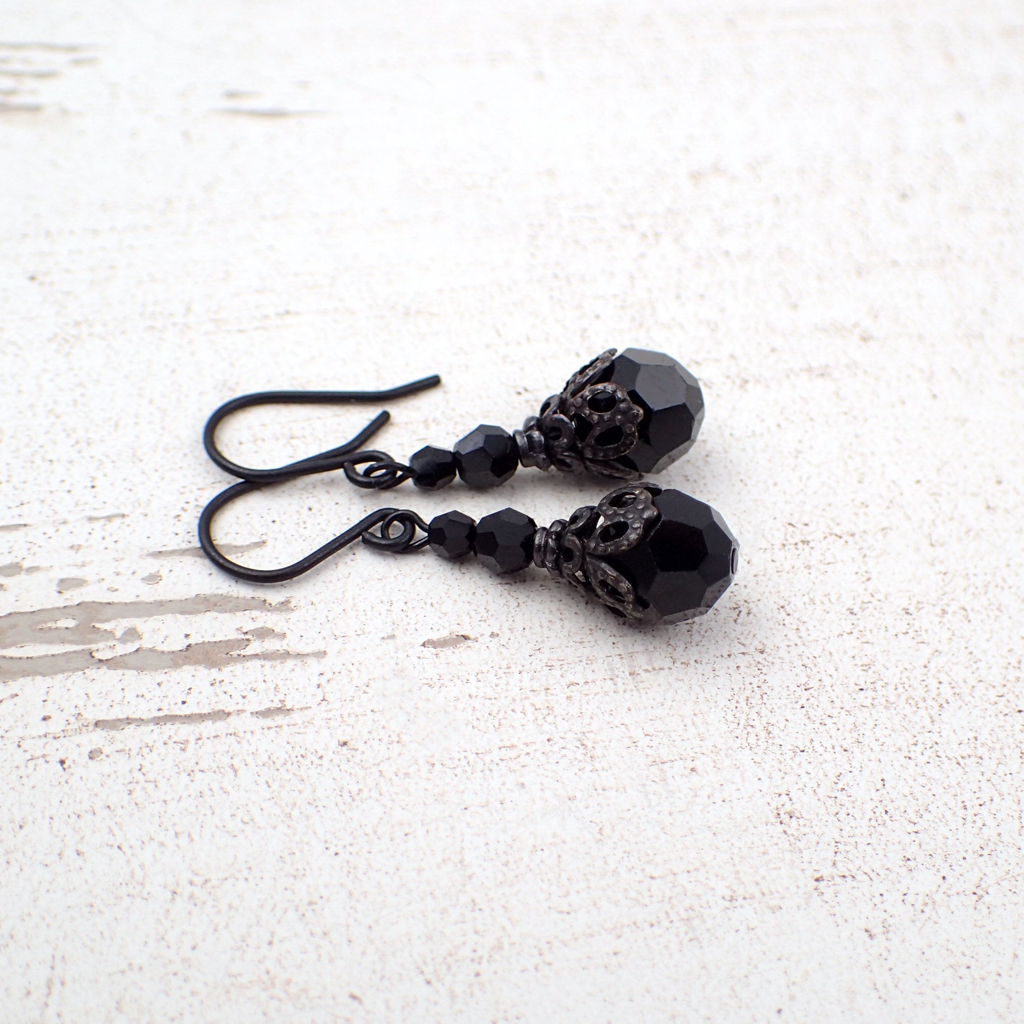 To make these earrings, I paired blackened brass filigree and adornments with romantic jet black Aus...