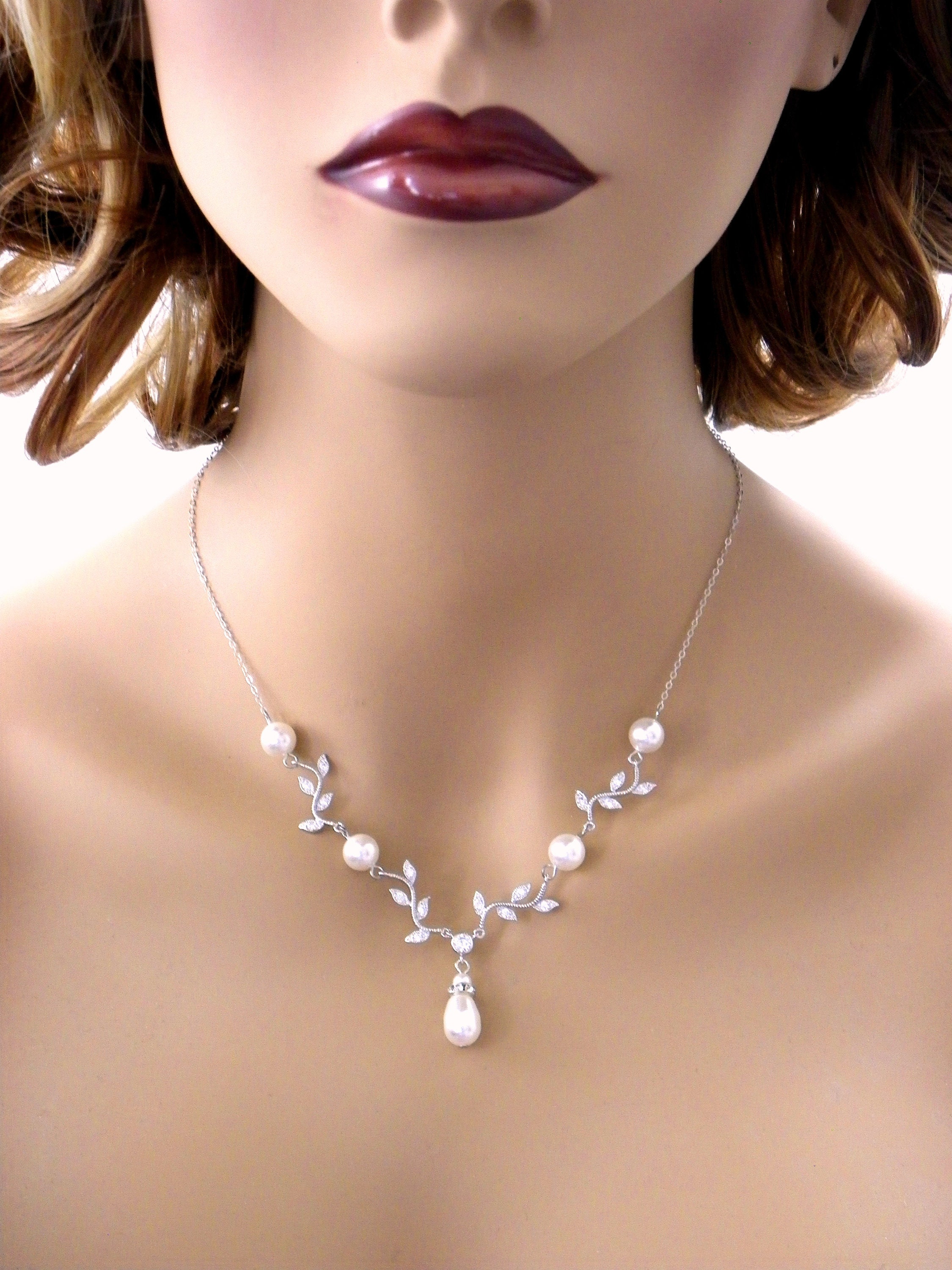 Ivory drop Pearl Earrings, VINE Y Leaf pearl Necklace, wedding earr...