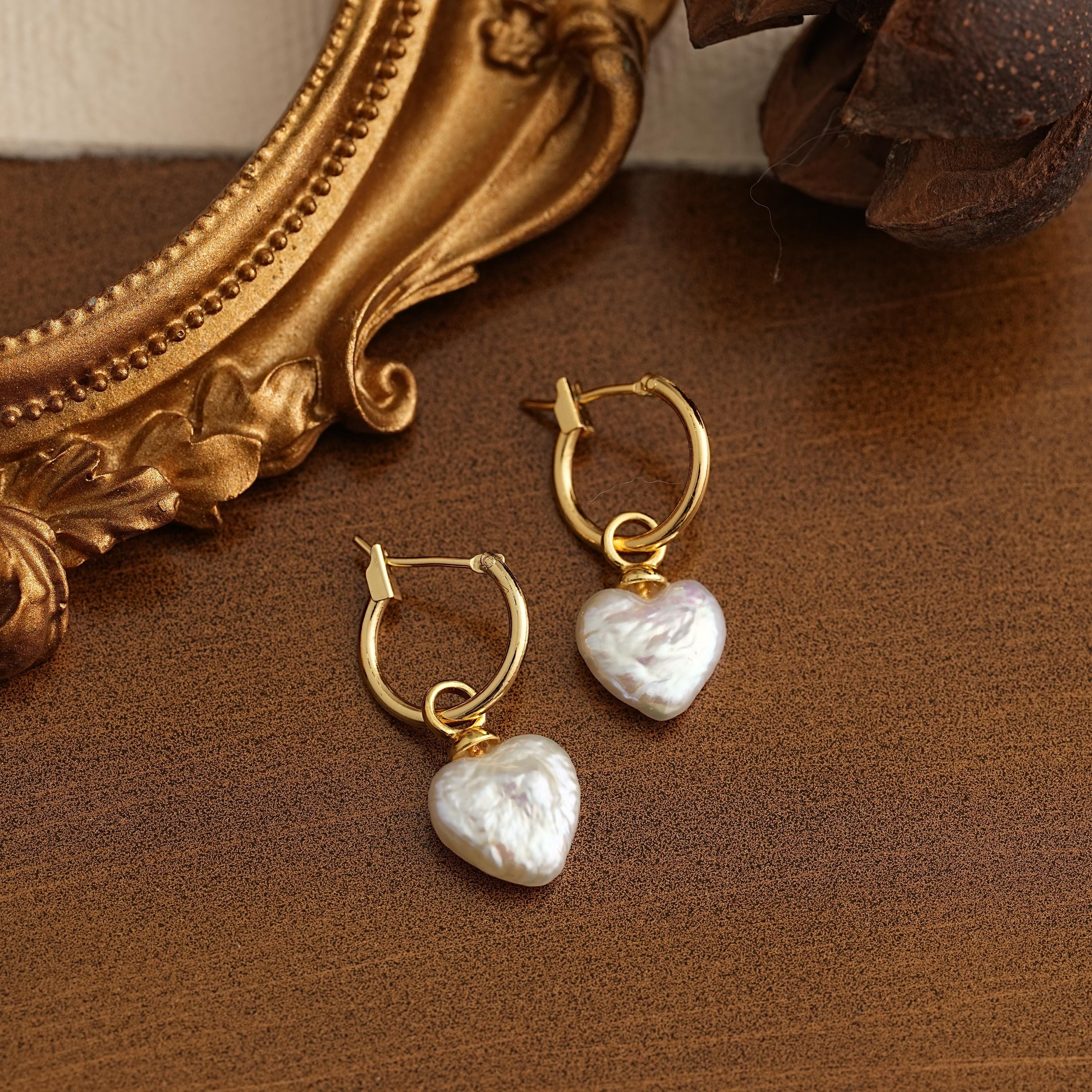 Baroque Pearl Heart Earrings,Gold Pearl Hoop Earrings,Pearl Drop Ea...