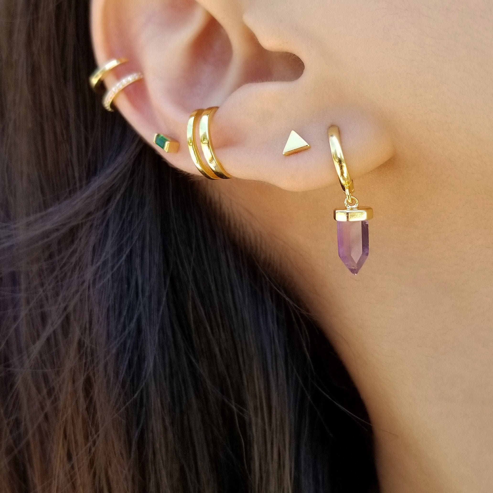 "These dainty drop earrings flaunt the natural beauty of faceted semiprecious stones within gli...