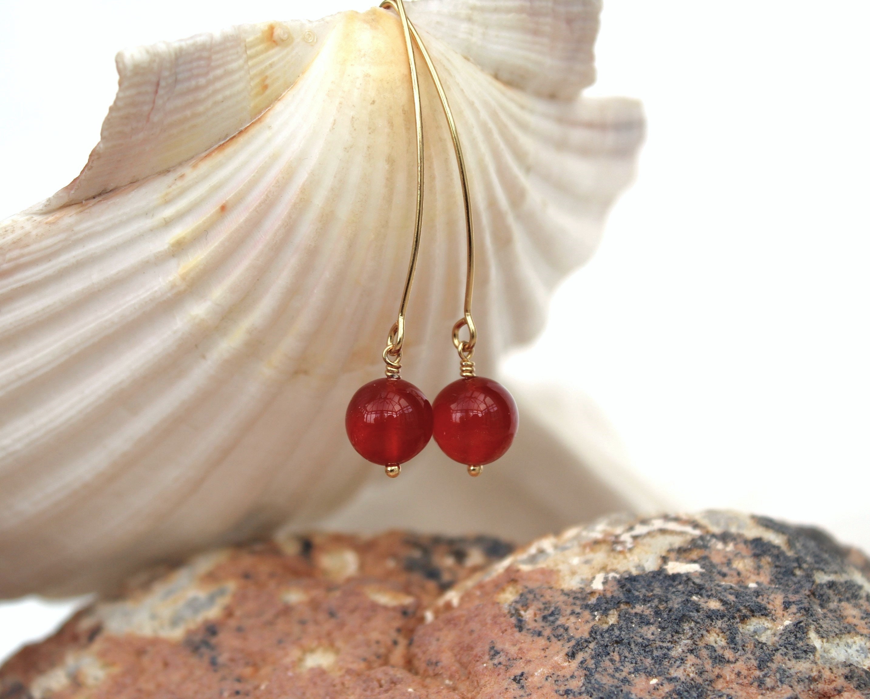 || D E T A I L S || Classic long red Agate drop earrings. These long slim gold ear wires give such a...