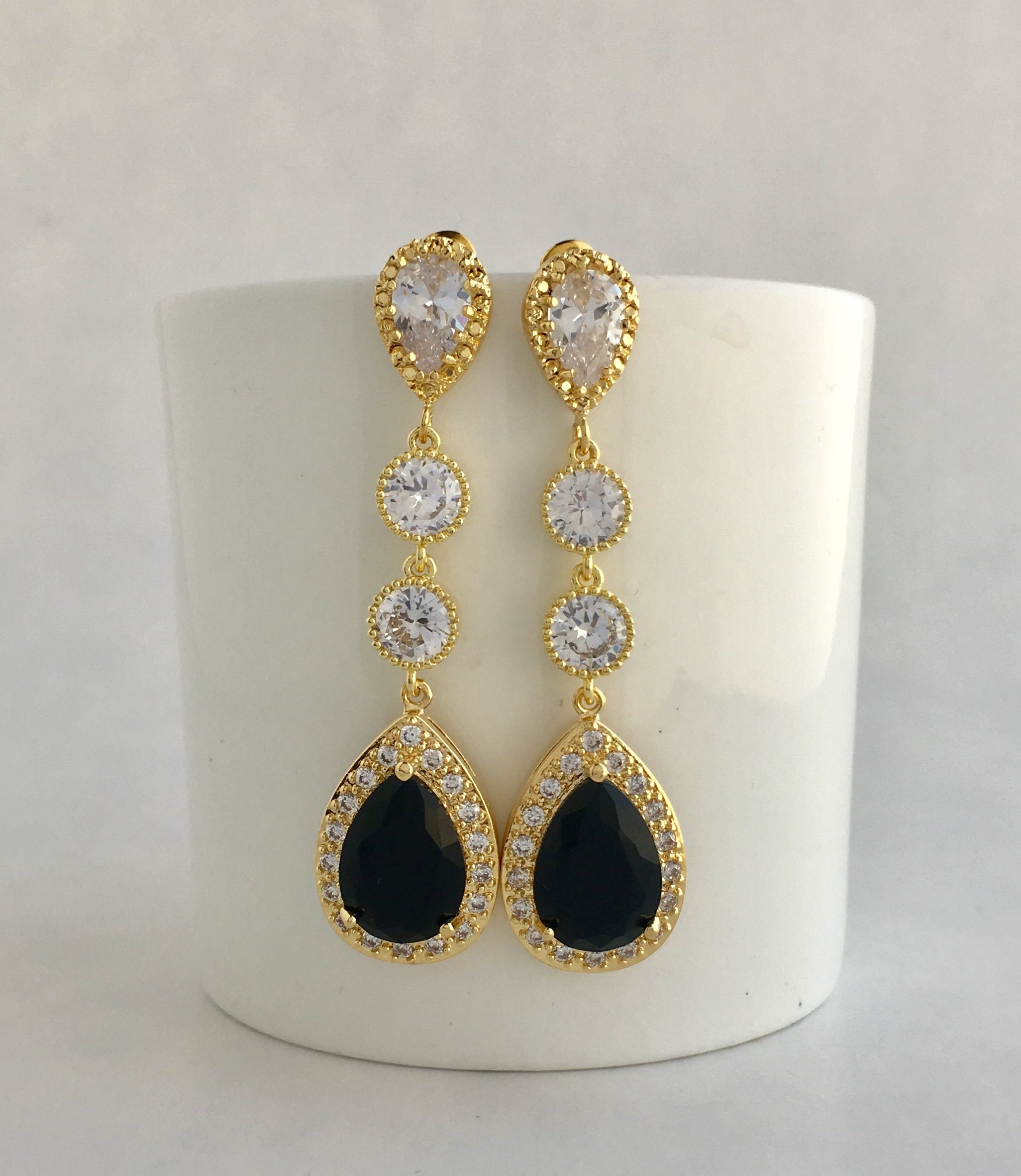I've created these gorgeous black cubic zirconia bridal tear drop earrings in gold plated brass sett...