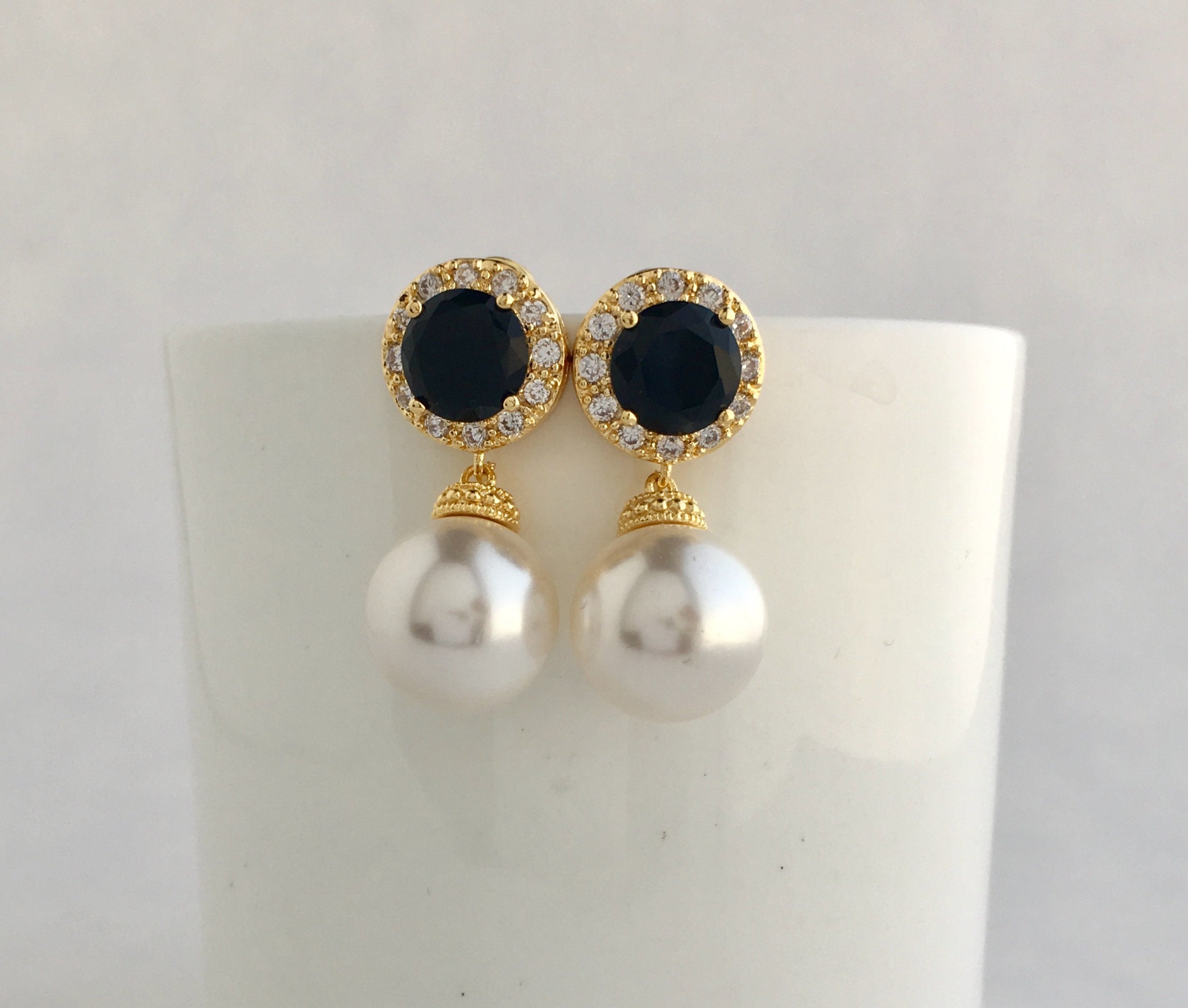 Black Pearl Earrings Black Bridal Halo Earrings Black Wedding Gold ...