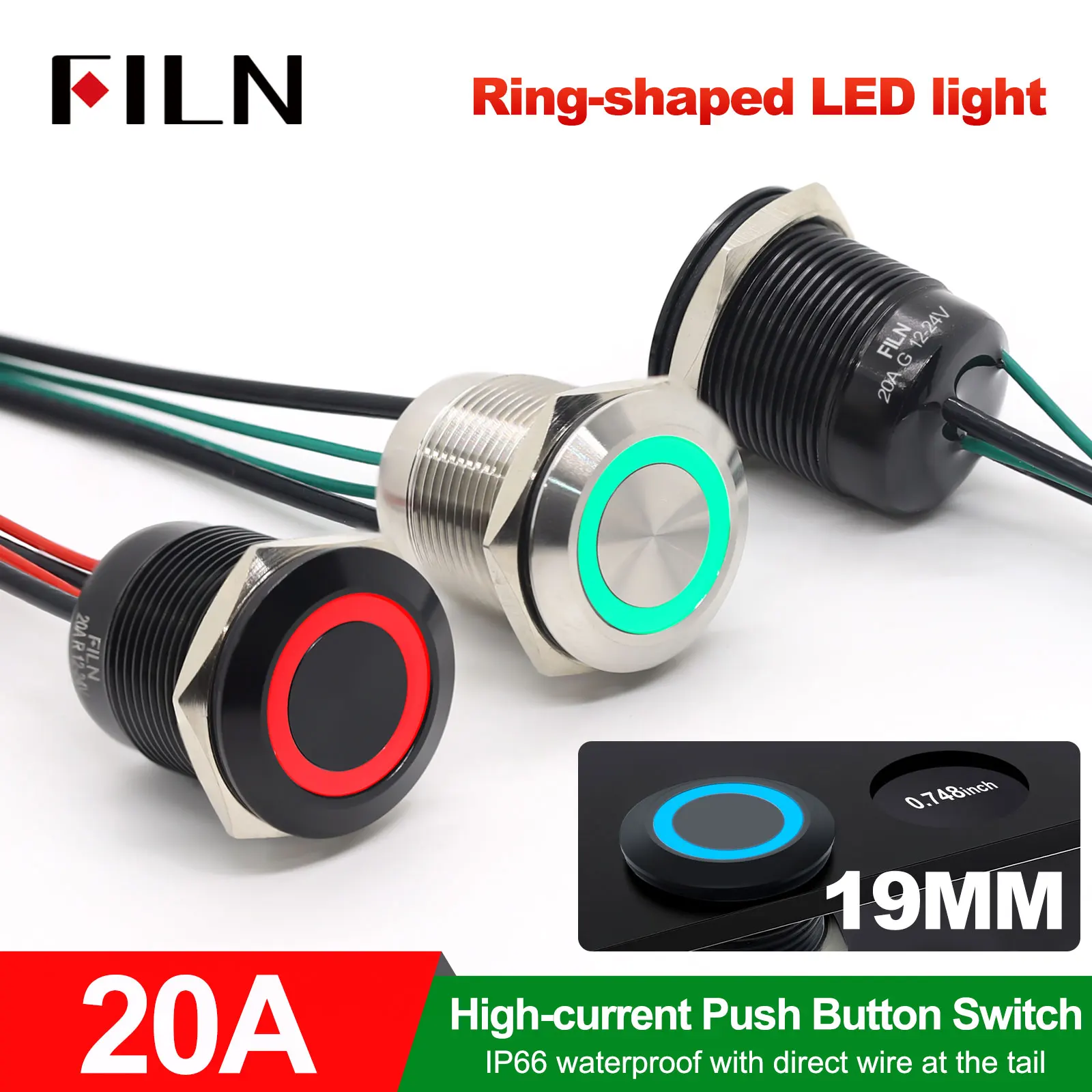 FILN 19mm 20A IP66 Waterproof 12V 24V 110V 220V Flat Ring Round Push Button Switch Black Metal Stain...