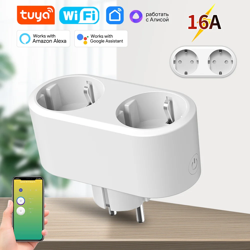 WiFi Smart Plug Dual Outlet 16A EU 2 in 1 Timer Socket Tuya Smart Life Remote APP Voice Control Work...