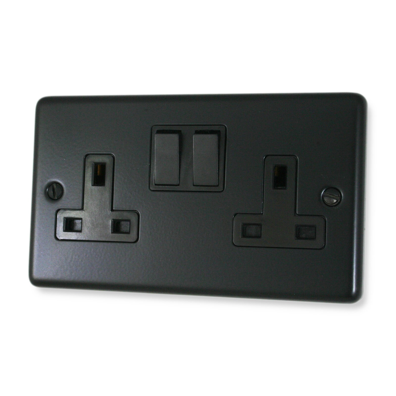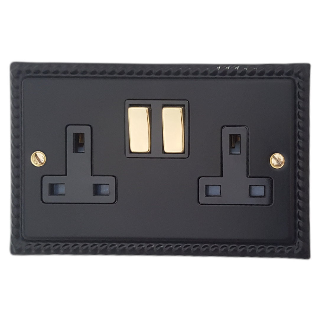 This is a matt black double socket plate with black switches. It is made in Britain by G+H Electrica...