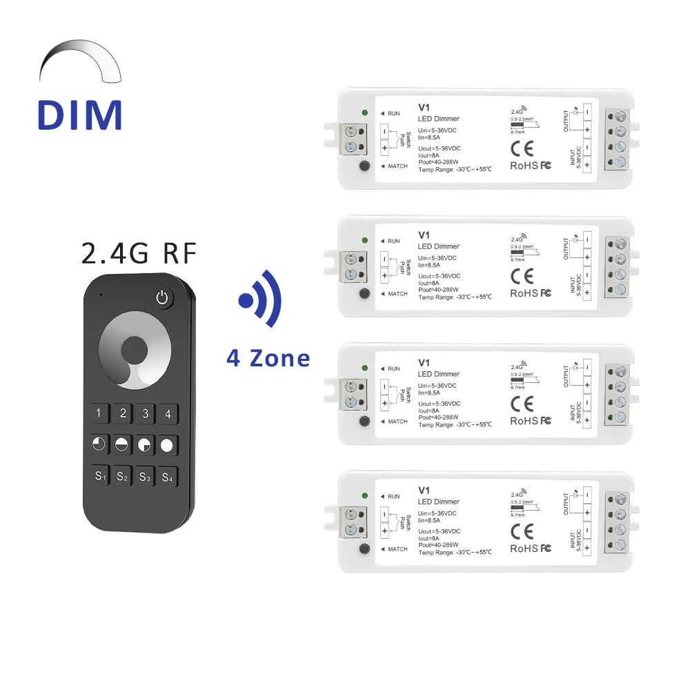 4 Zone LED Dimmer 12V 24V 36V Single Color LED Strip Dimming Kit Wireless Wifi 2.4G RF Remote Contro...
