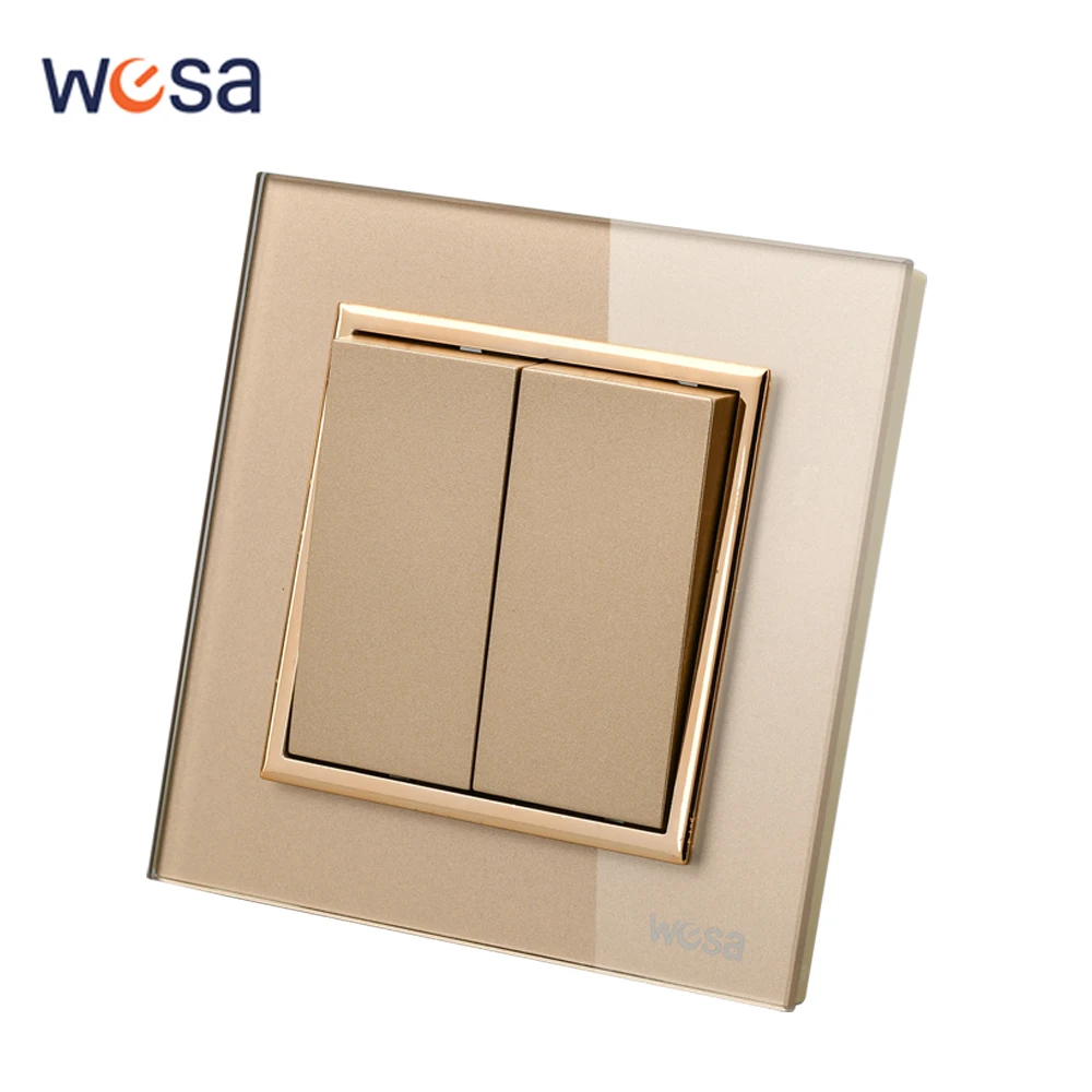 WESA Luxury Crystal Tempered Glass Panel Gold Wall Switch Flame retardant 2 Gang 1 Way Wall Rocker S...
