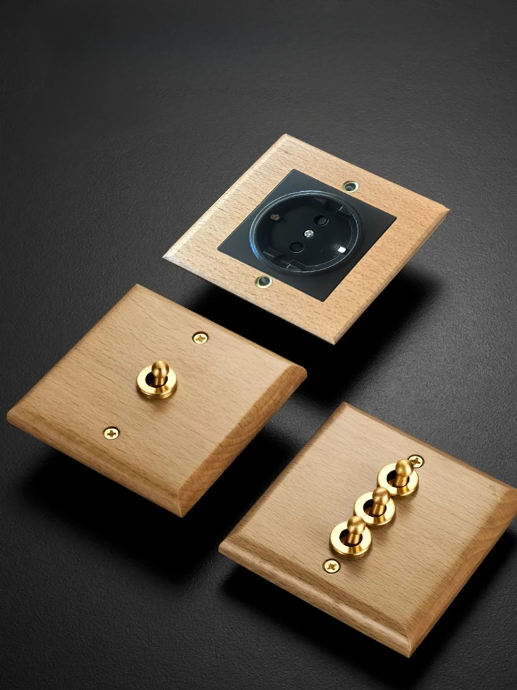 1/2gang2way Wall Light Switch Solid Wood Panel Retro Toggle Switch Brass Lever EU Power Socket Europ...