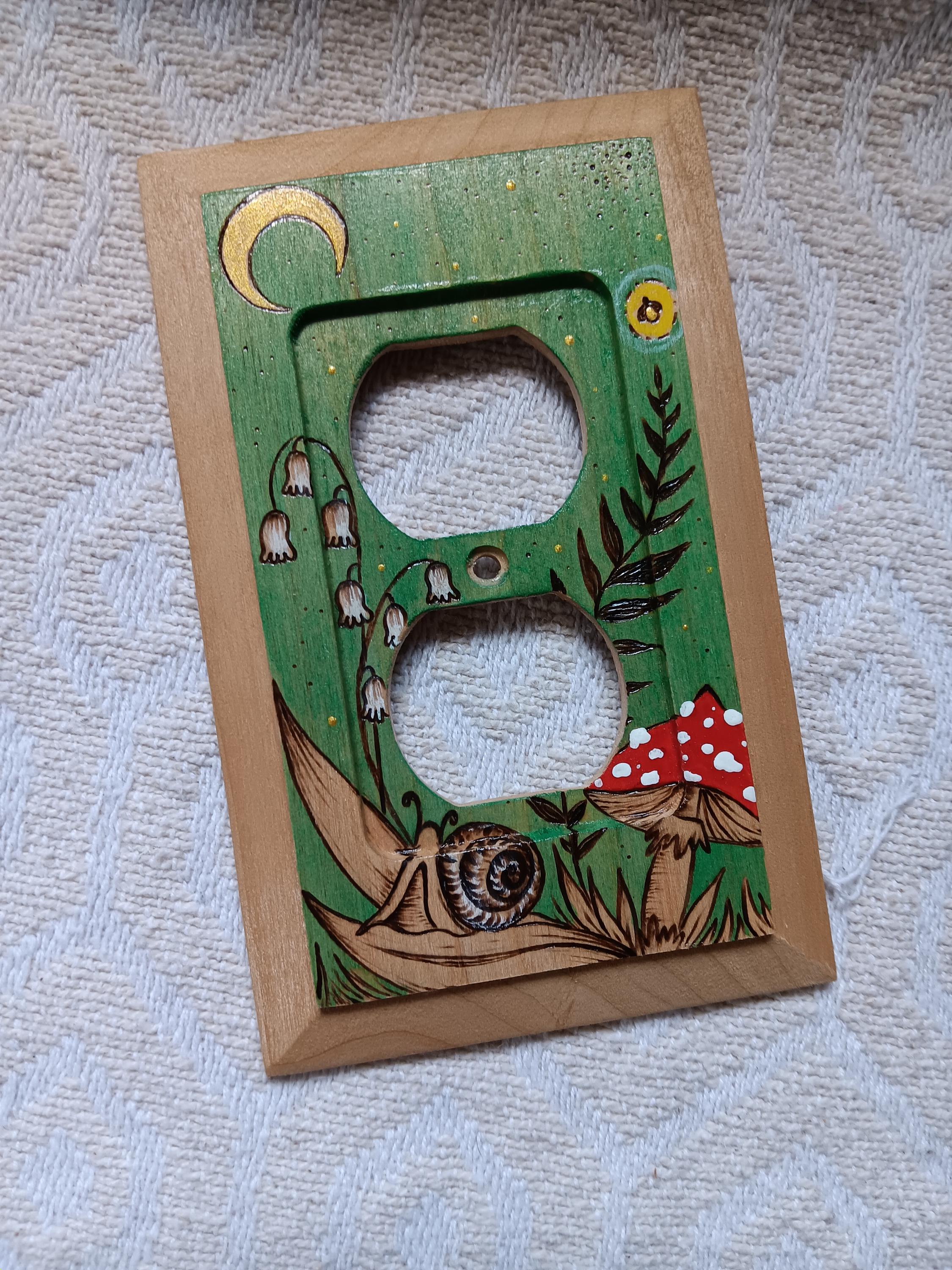 Botanical Wood Duplex Outlet Cover: Snail & Mushroom Decor Wood...