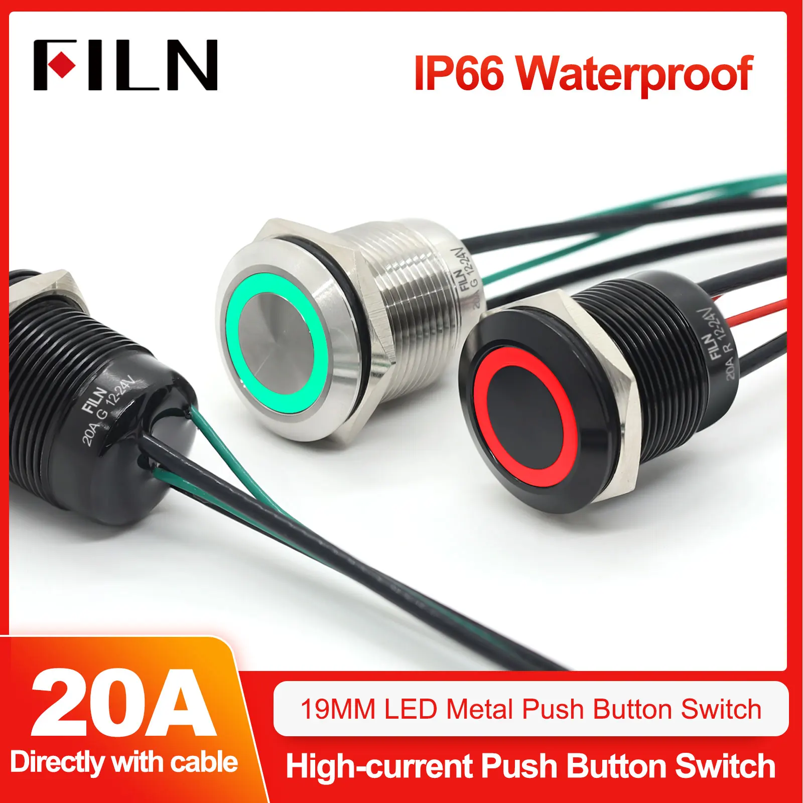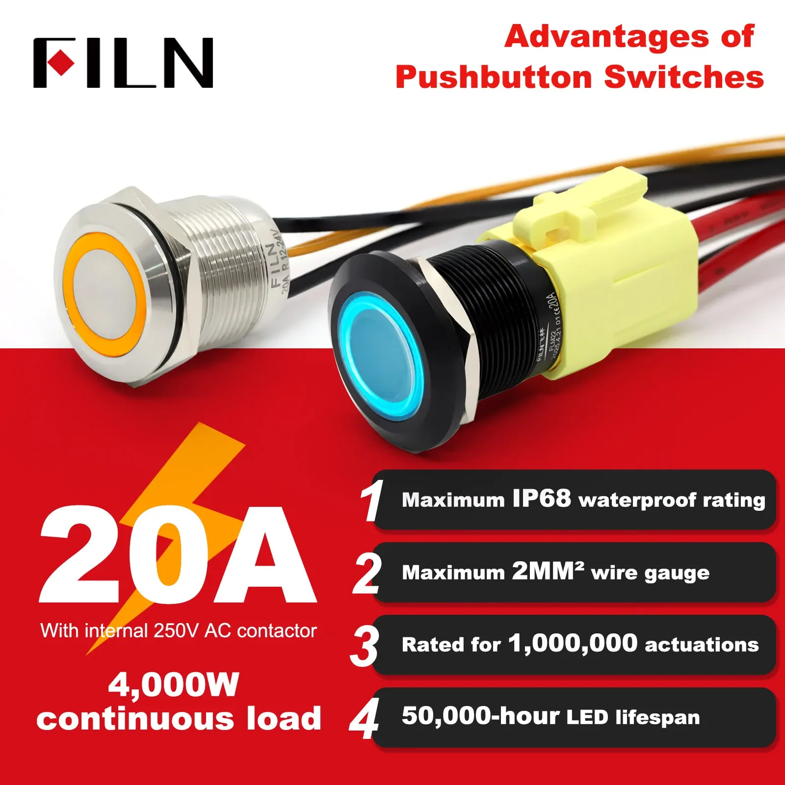 FILN 19mm IP68 Waterproof Stainless Steel Push Button Switch 20A 12V 24V 110V 220V High Current Flat...