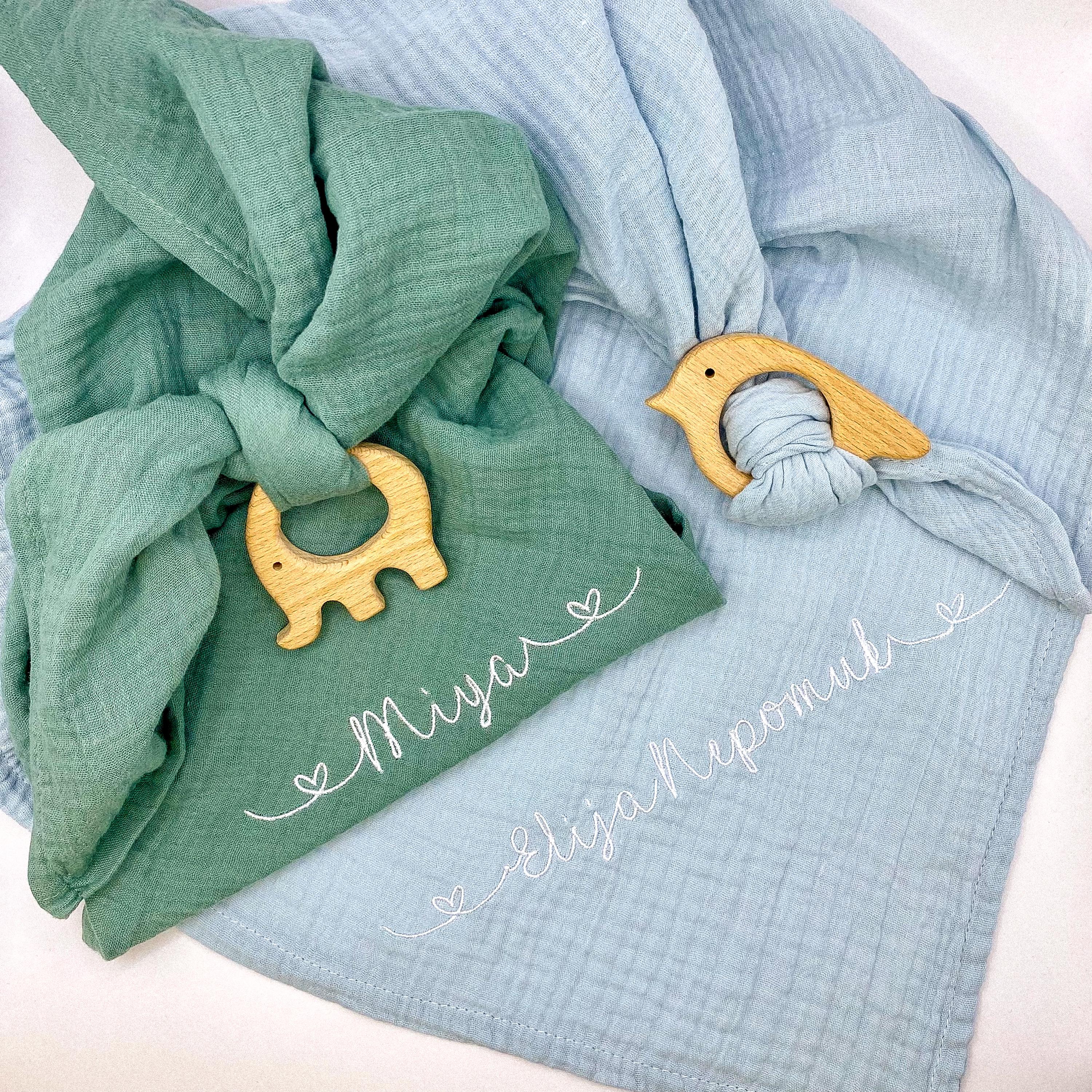 Burp cloth personalized with name and wooden grasping toy - muslin ...