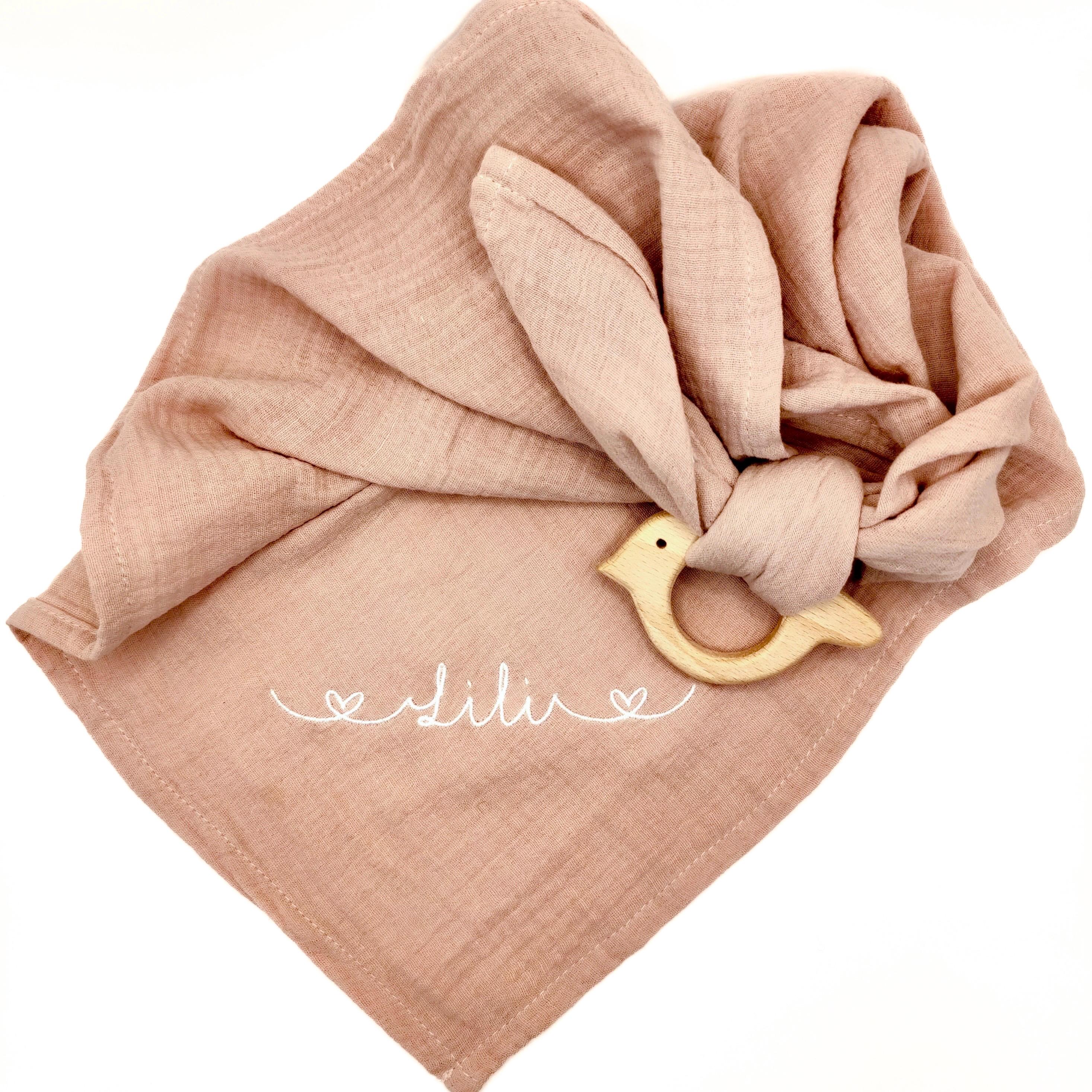 Burp cloth embroidered with name + with wooden grasping toy - musli...