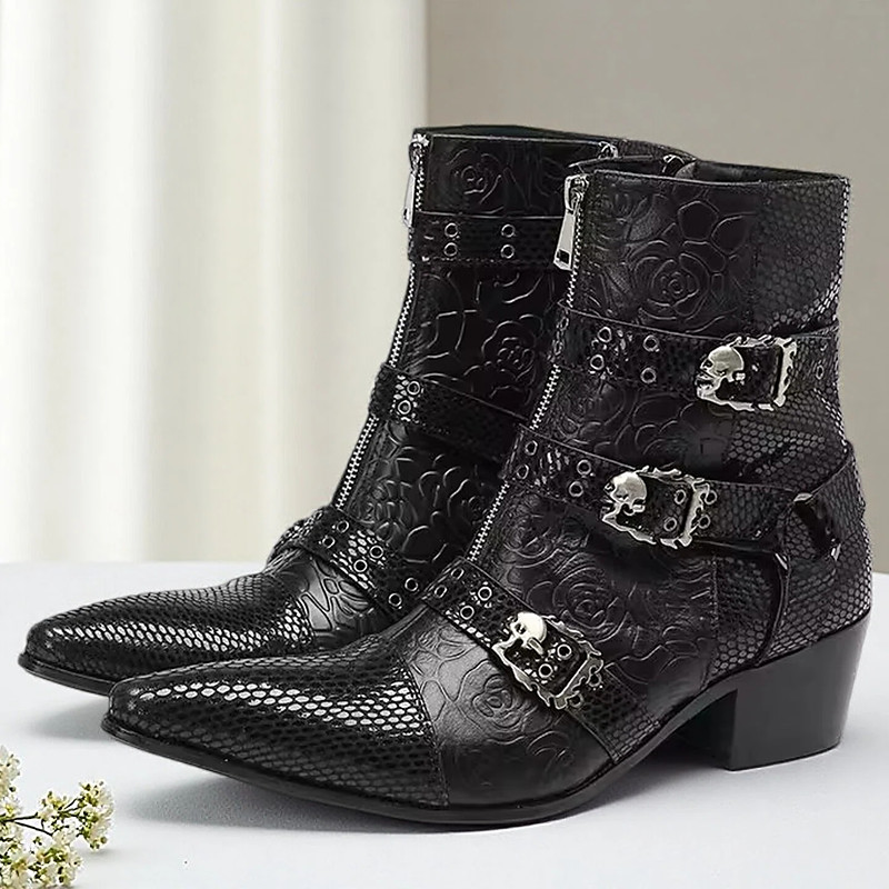 Men's Black Embossed Leather Buckle Boots – Classic Design wi...