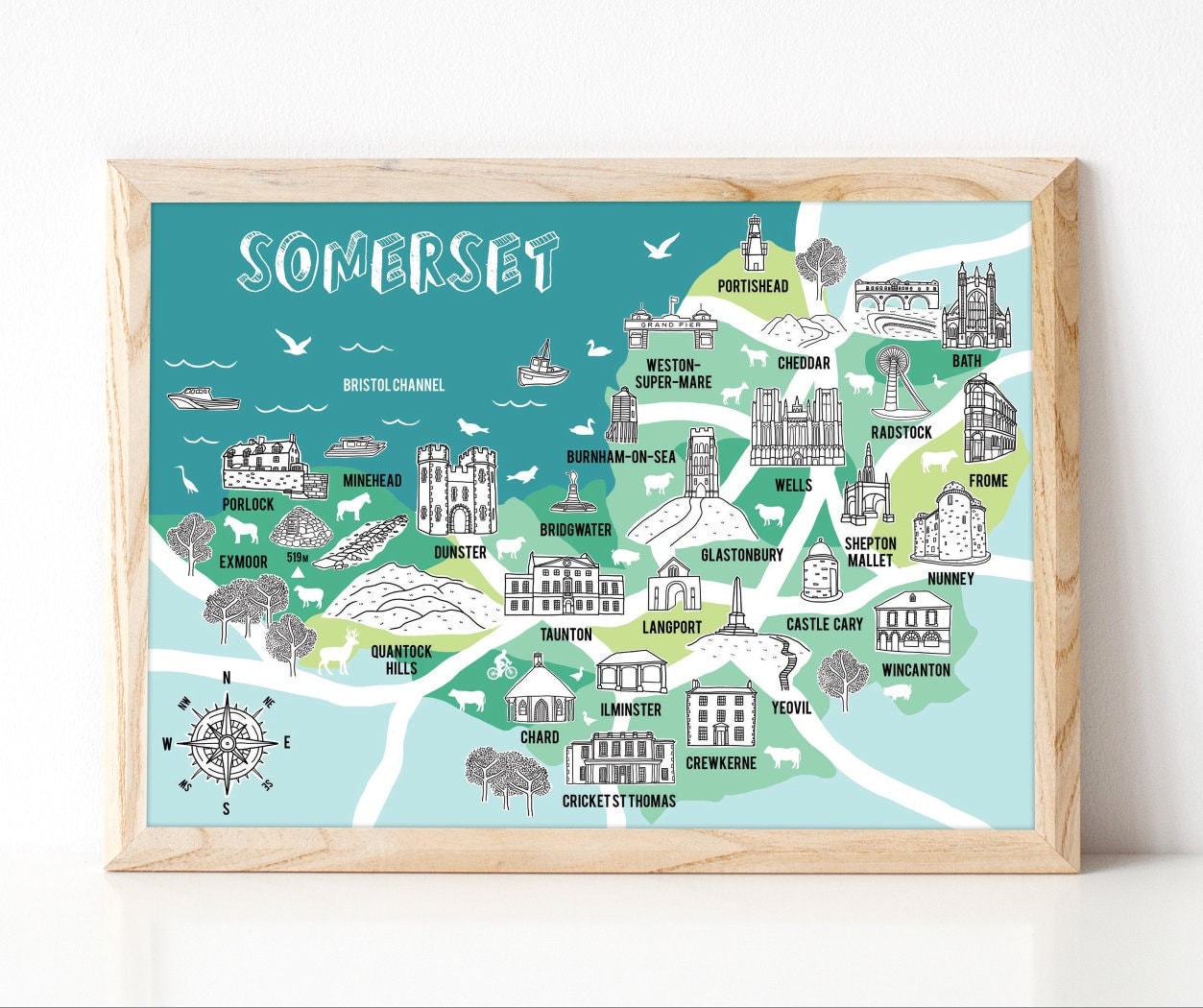 Somerset Map, Illustrated Map, Somerset Gift, County Map, Map gift,...