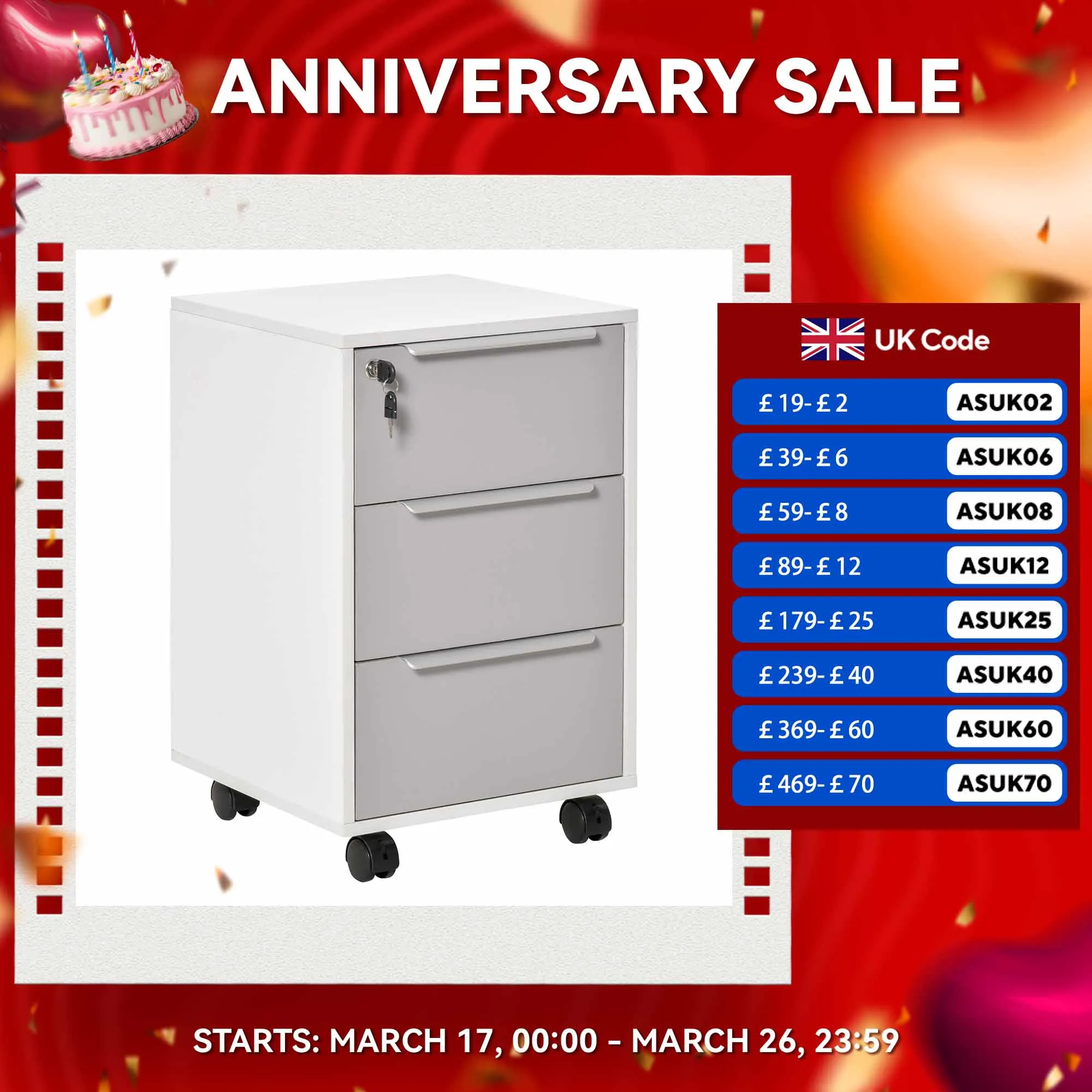 HOMCOM Modern 3-Drawer Locking File Cabinet Mobile Chest of Drawers Side Table