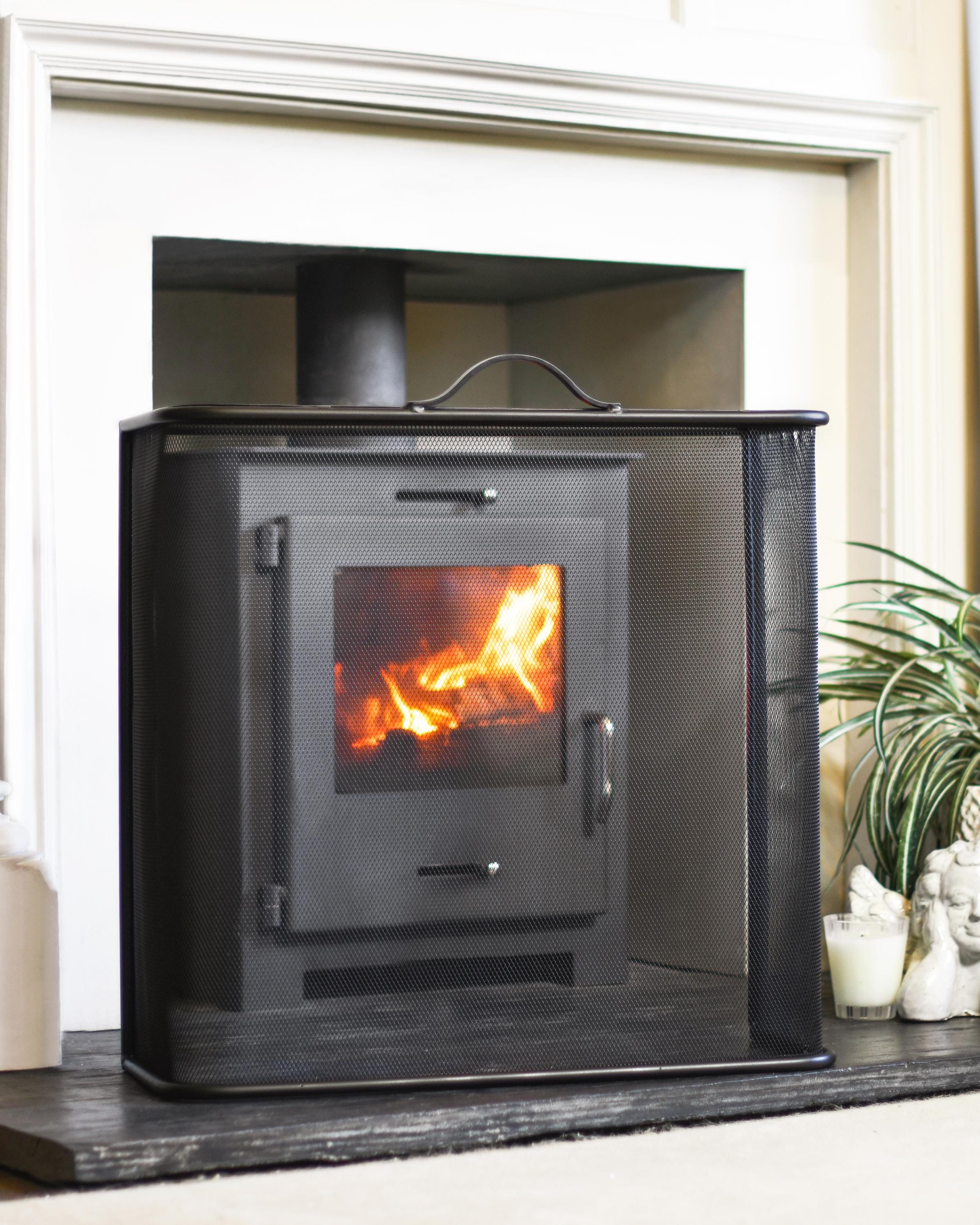 "A classic three fold fireguard with integrated mesh netting, to stop debris and spitting ember...
