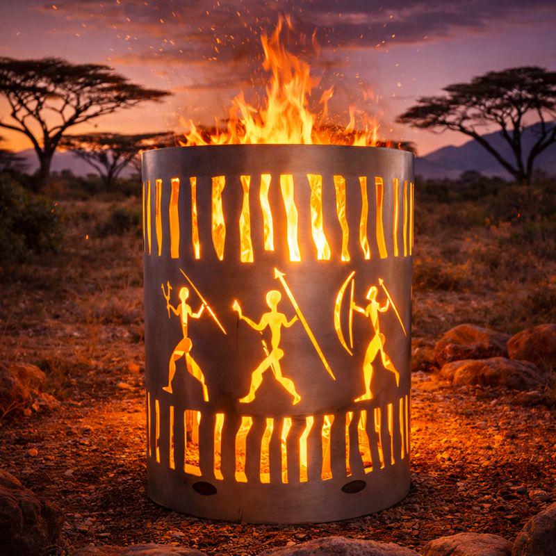 African Warrior Fire Barrel - Decorative Fire Basket for Garden & Terrace This unique fire pit w...
