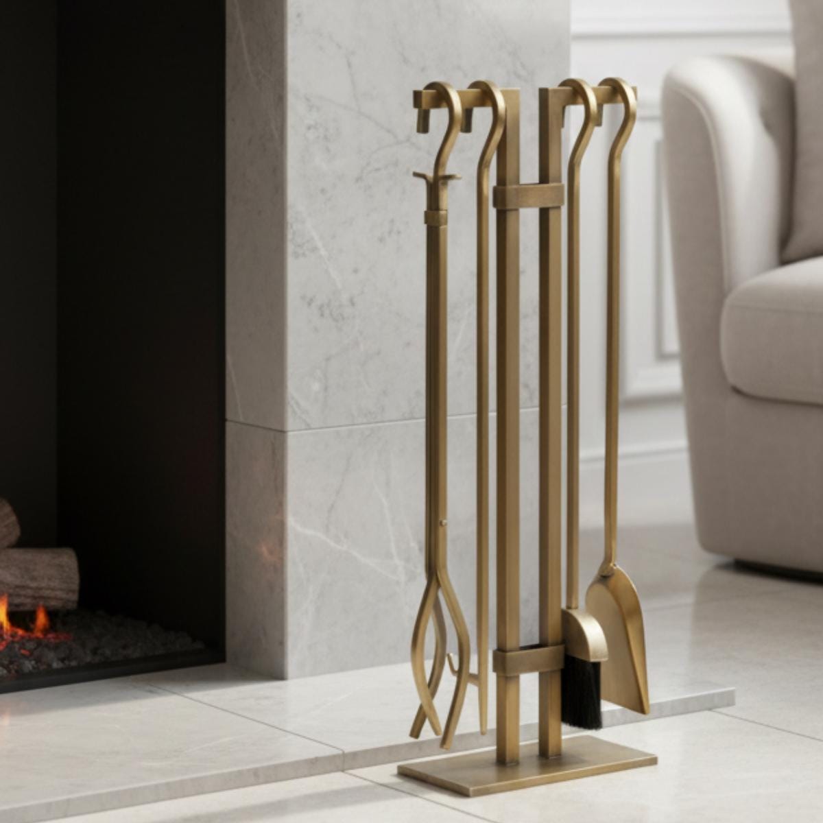 "Antique Brass Finish Fireplace Tool Set - 5-Piece Modern Hear...