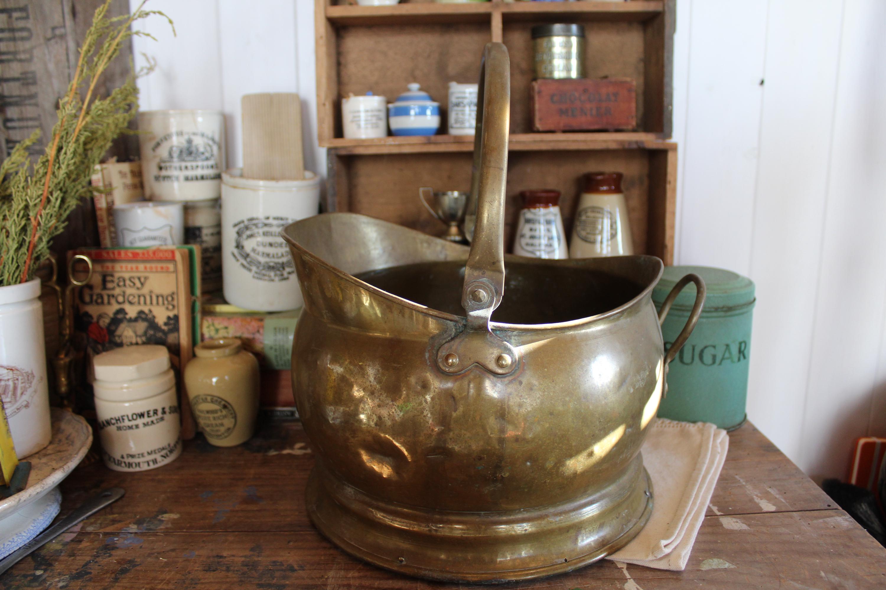 Small Antique Brass Coal Bucket, Kindling Storage, Planter