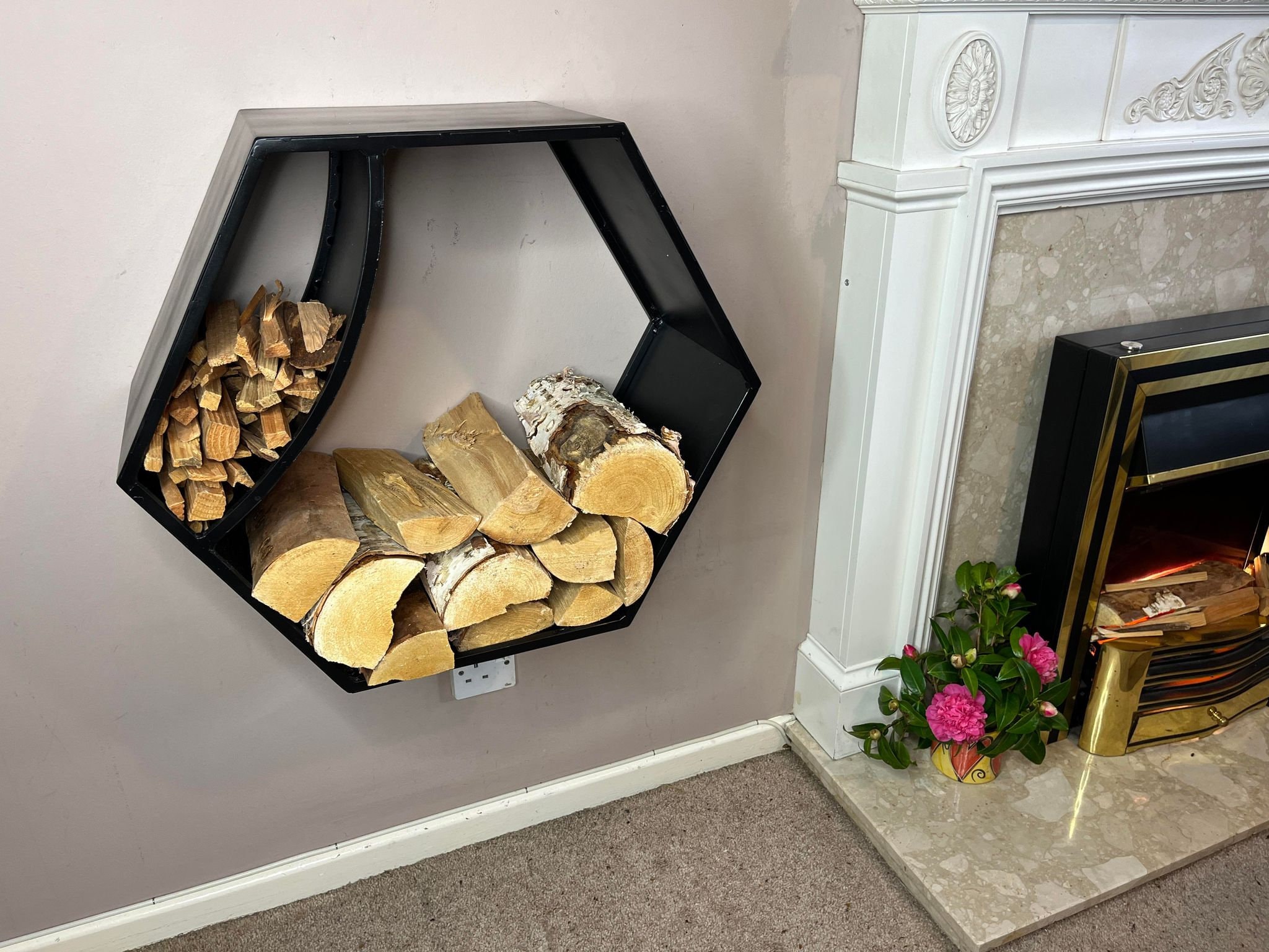 "Introducing our newest design log store: \"The Honeycomb\". This wall-mounted hexago...