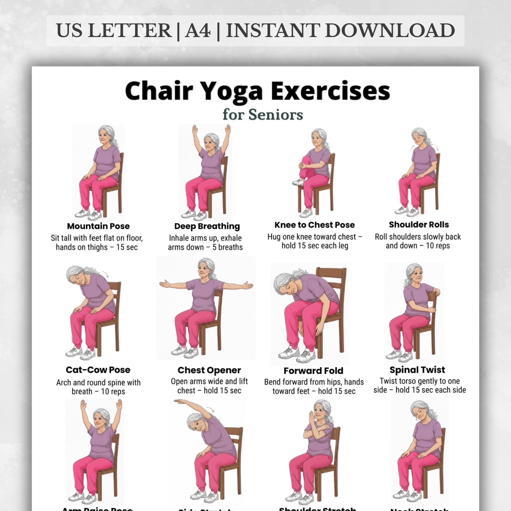 Chair Yoga for Seniors is a printable exercise chart designed for seated yoga routines at home. The ...
