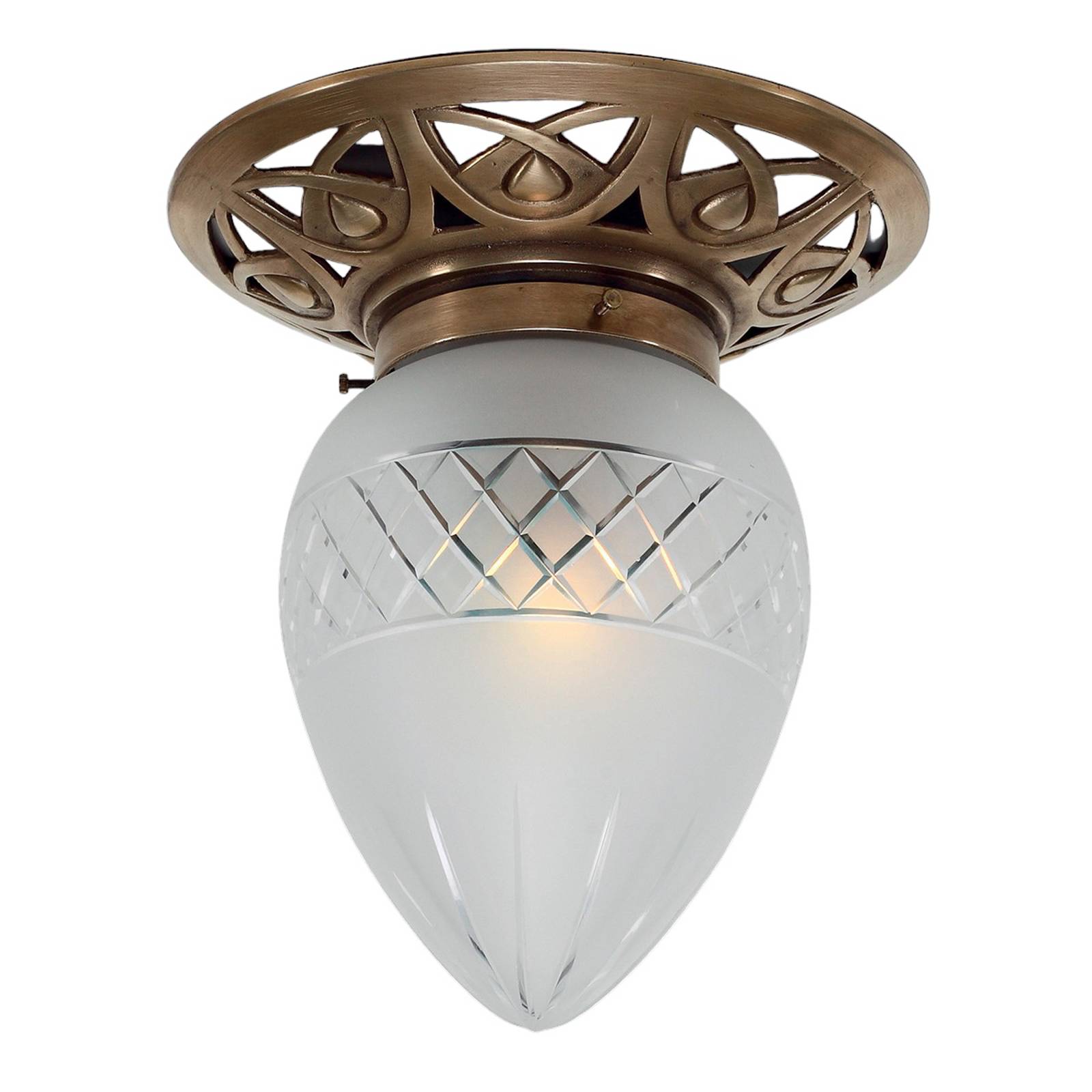 Beautiful ceiling lamp Pauline made of brass: The shapely glass shade on the richly decorated frame ...
